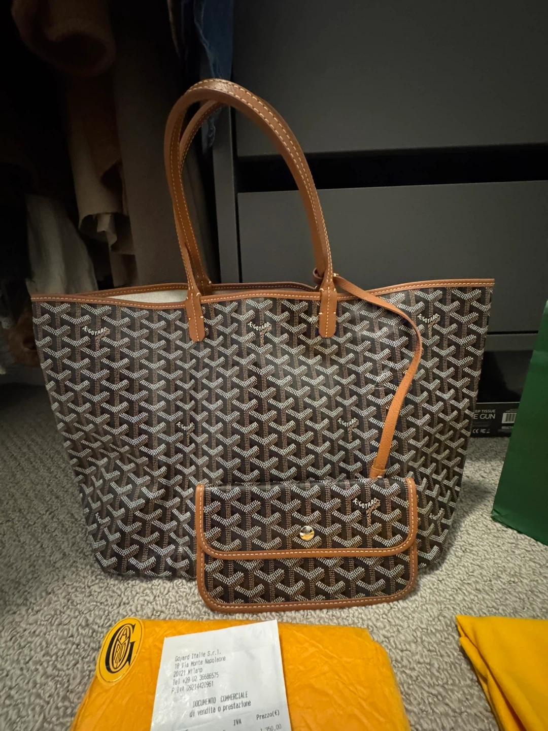 This is a classic Goyard tote bag with its matching pouch. It's made from their signature coated canvas with leather trim. A great everyday bag for essentials!