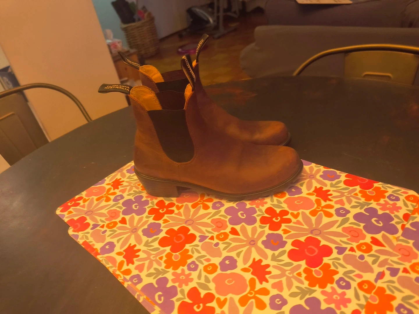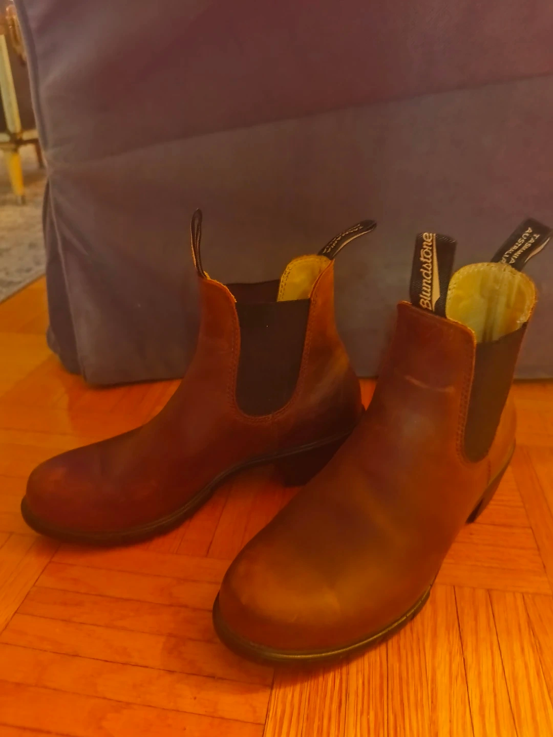 Brown leather Blundstone Chelsea boots. Easy to slip on and off. Durable construction for everyday wear.