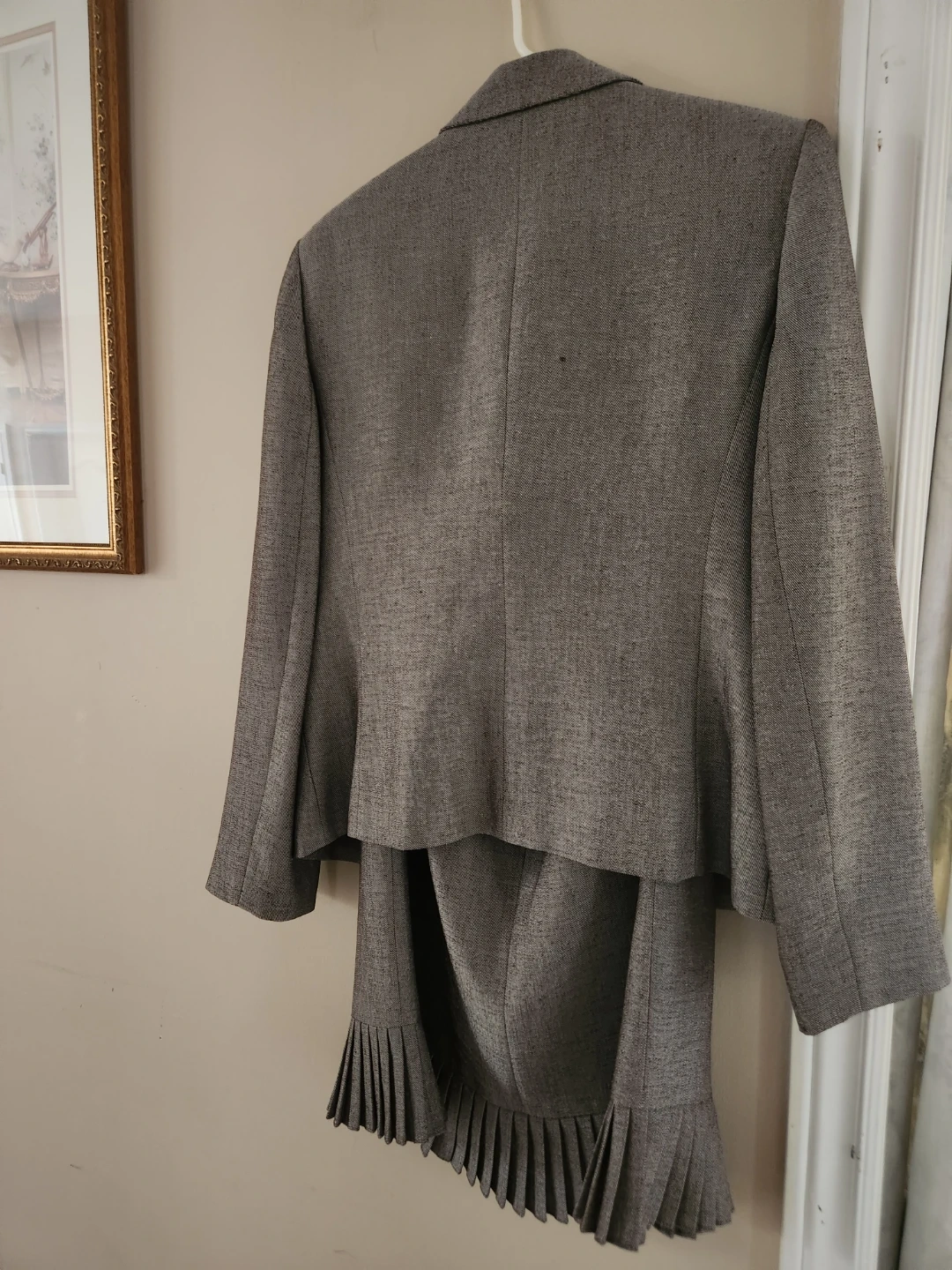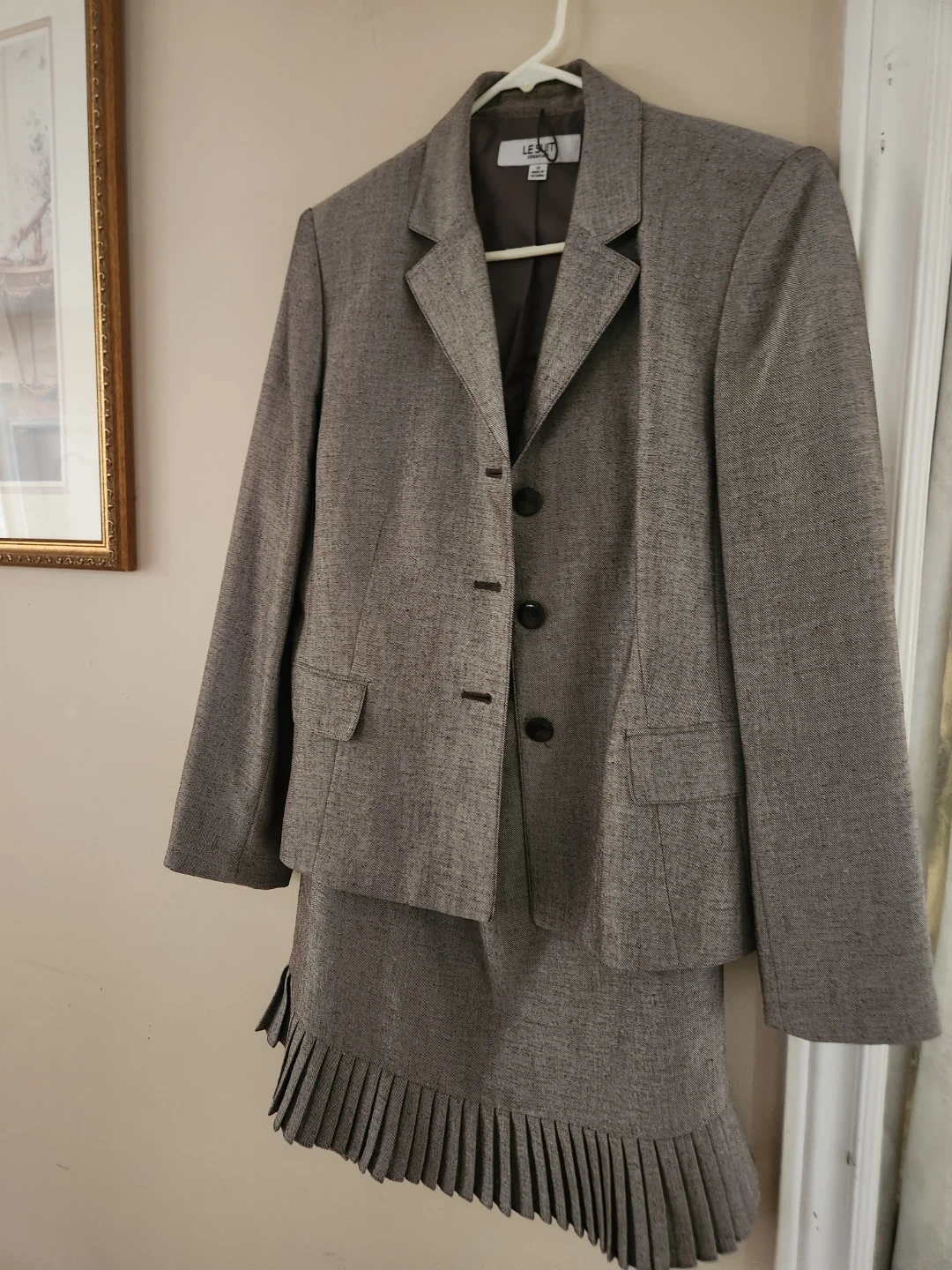 This Le Suit Essentials skirt suit comes in a classic grey tweed-like fabric. It features a blazer with a three-button closure and a pleated skirt. The blazer is lined and includes pockets. Made in Vietnam, size 12. It's a polished choice for professional settings!