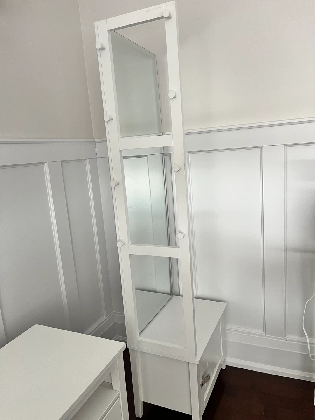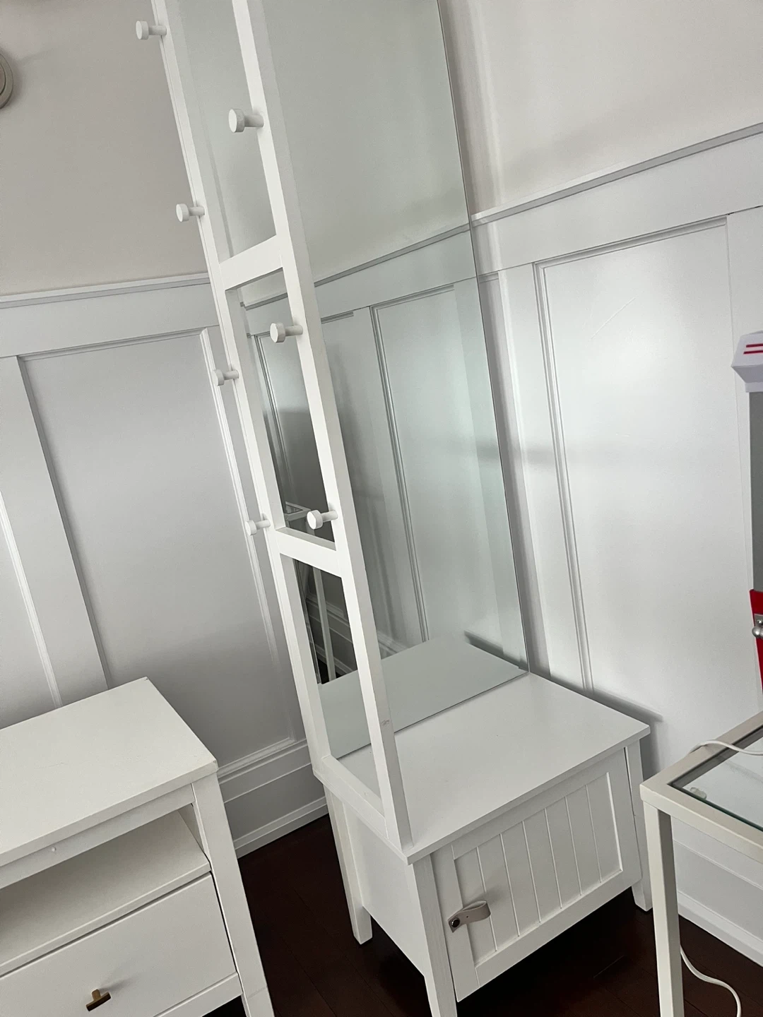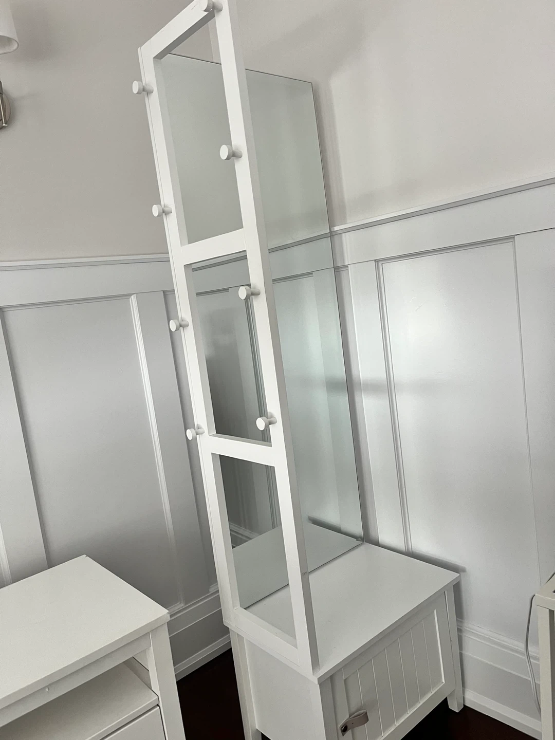 This hall tree features a tall mirror with multiple hooks on the side and a storage bench. The bench offers convenient storage behind a cabinet door.