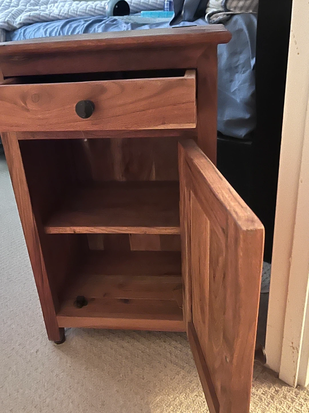 This nightstand is made of solid wood with a warm finish. It features a single drawer at the top and a cabinet below for storage. The cabinet doors open to reveal shelves inside. This piece would work well next to a bed or as a side table.
