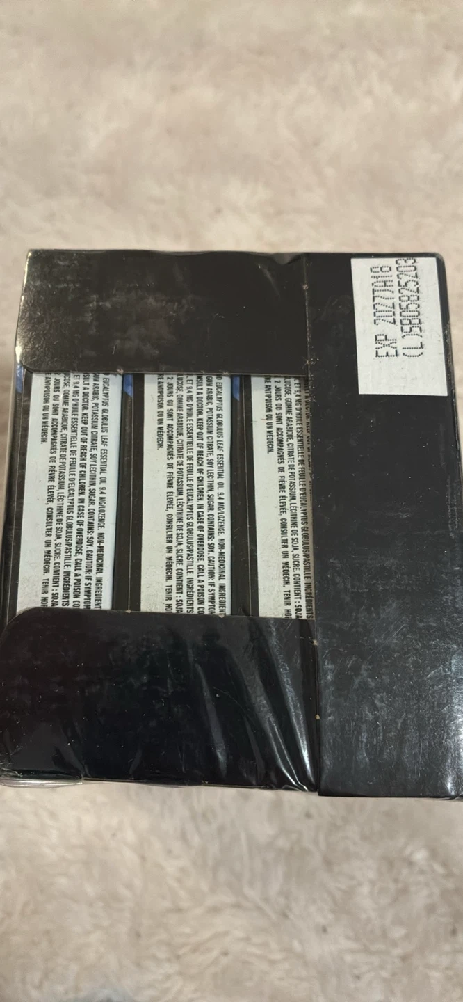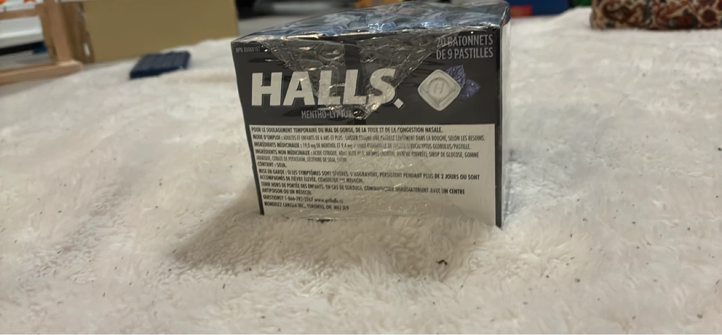 This box contains 20 packages of Halls Mentho-Lyptus cough drops, with 9 lozenges per package. It's for the temporary relief of sore throat, cough, and nasal congestion. Medicinal ingredients include menthol and eucalyptus globulus leaf oil.