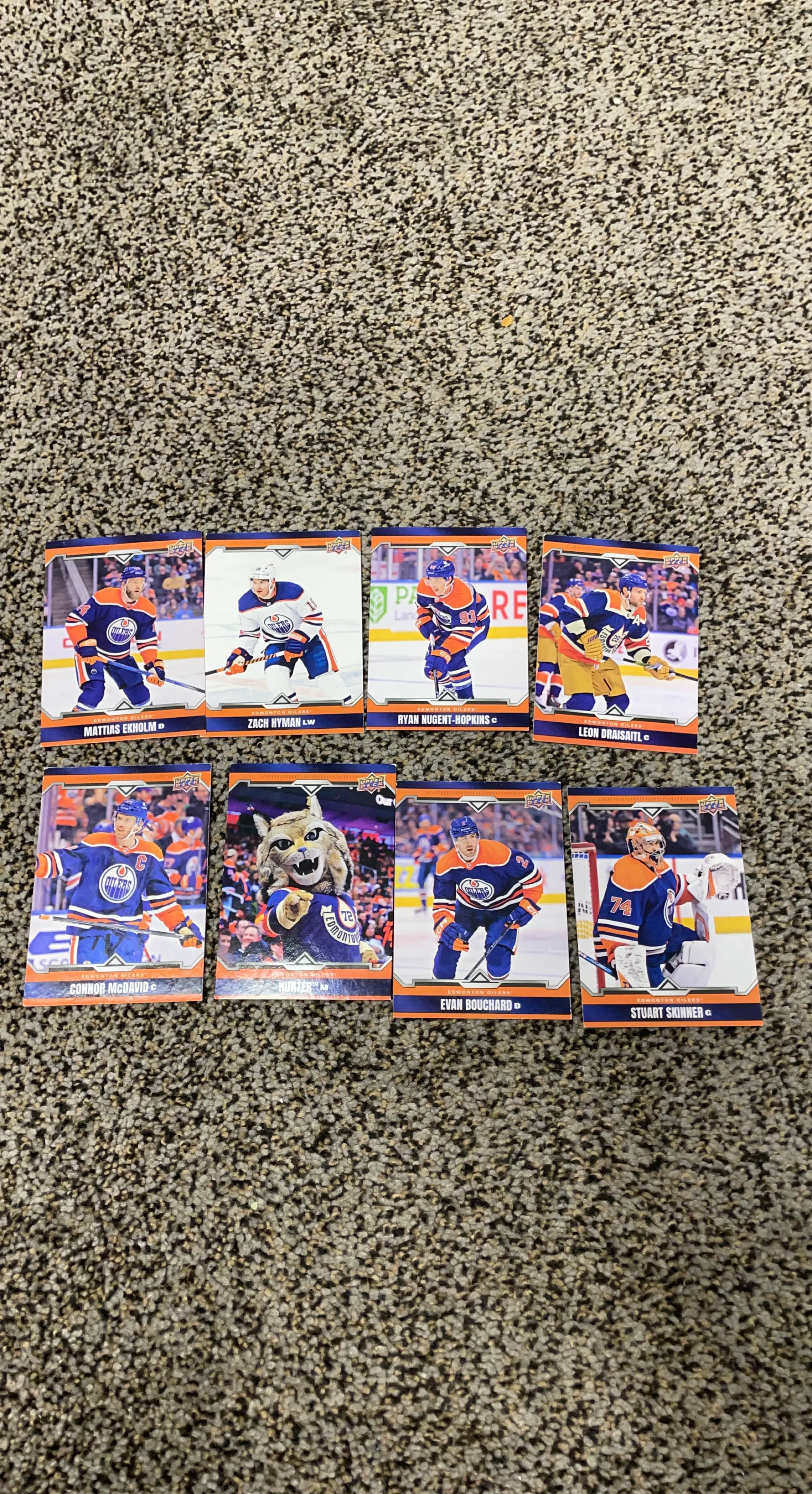 Collection of Upper Deck Edmonton Oilers hockey cards featuring players like Connor McDavid, Leon Draisaitl, and Stuart Skinner. Also includes a card of the team mascot, Hunter. Cards are standard trading card size.