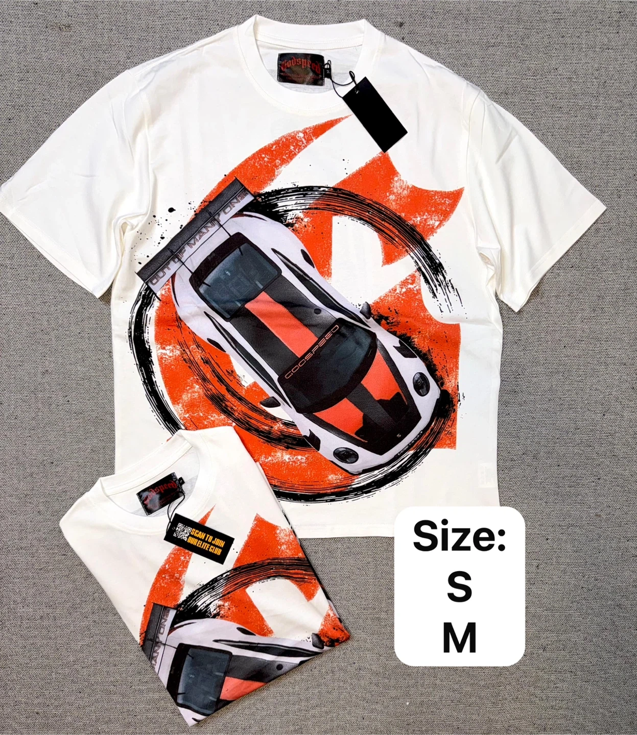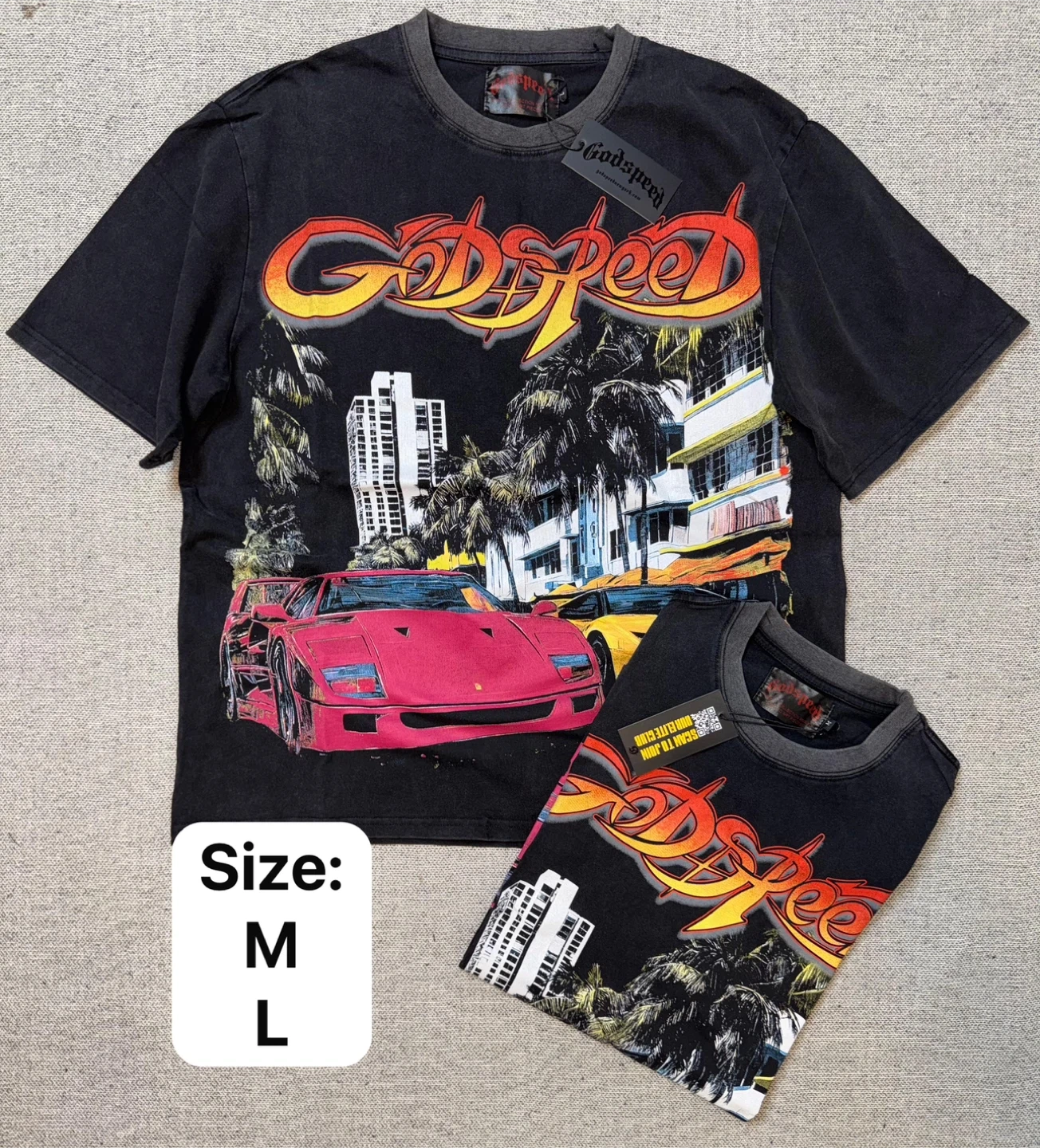 Cool graphic t-shirts from Godspeed. Available in various designs featuring cars, landmarks, and sci-fi themes. Cotton material for comfort. Check photos for specific sizes like S, M, L, and XL.