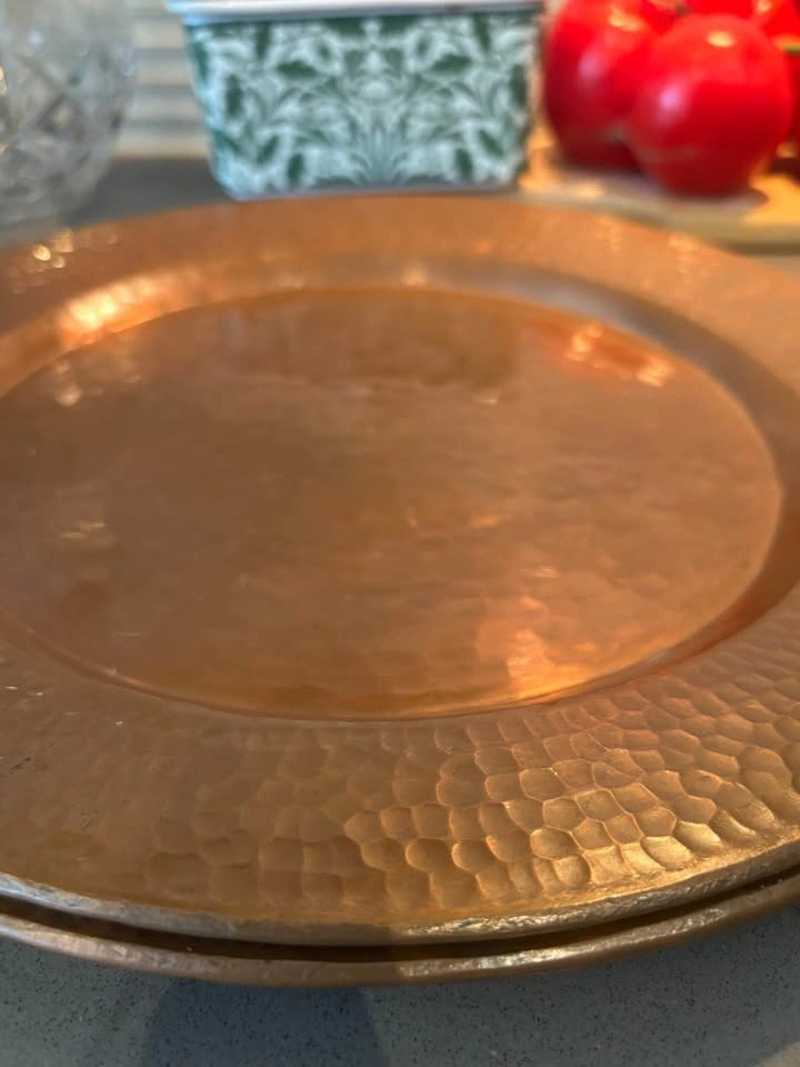 These are genuine solid copper (not plated or thin imports) with a lovely warm patina and classic hand-hammered texture that catches the light beautifully. The weight gives them a substantial, high-quality feel that lighter modern pieces simply don’t have.