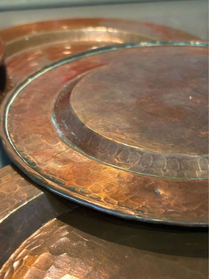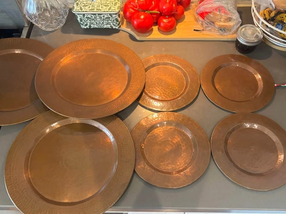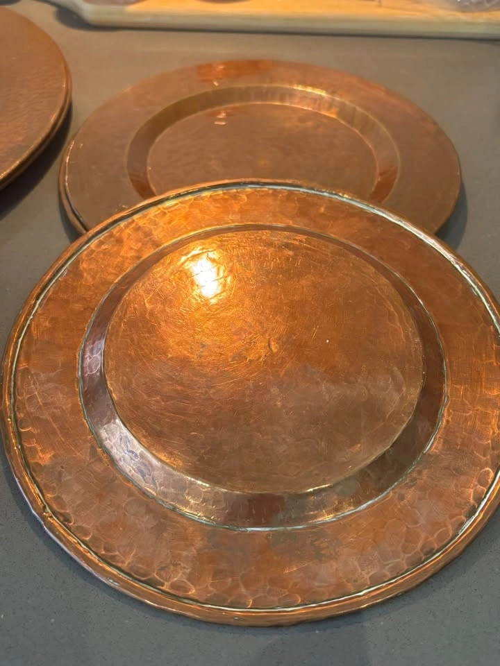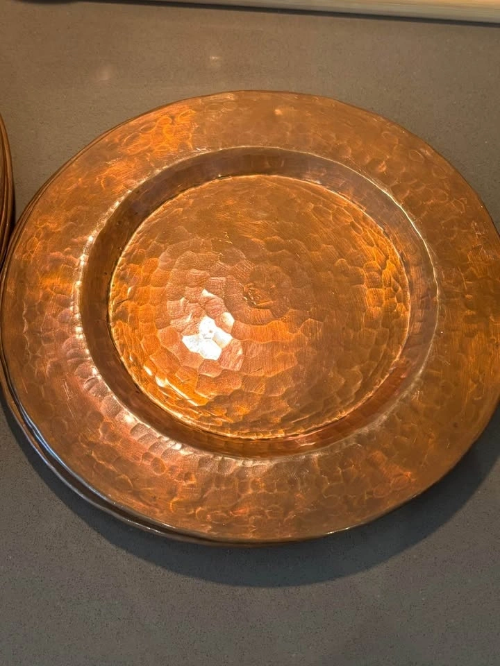 Beautiful set of 7 hand-hammered solid copper plates in two sizes — perfect for rustic, farmhouse, industrial, or boho table settings, wedding decor, or wall art displays.