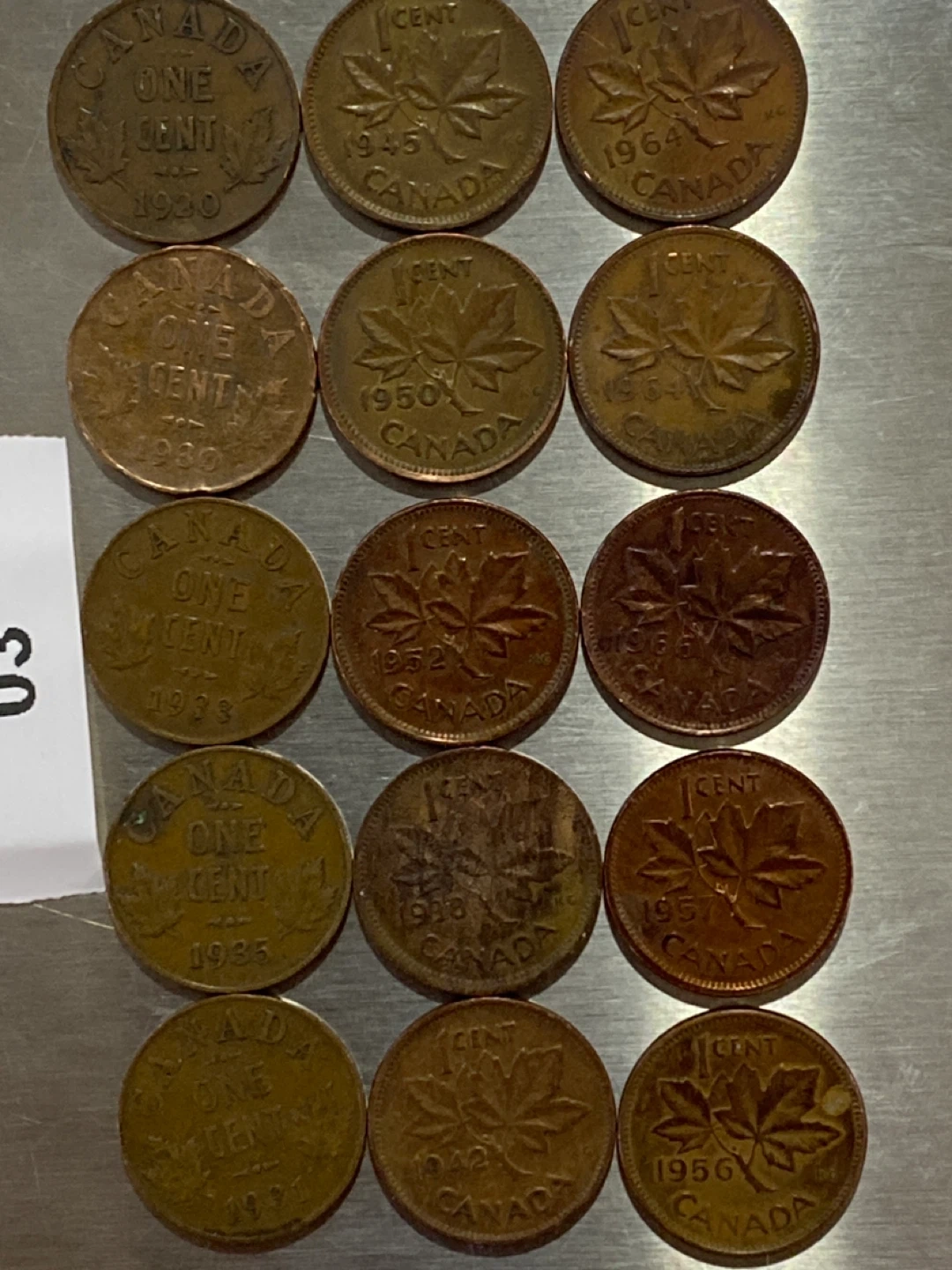 This is a lot of assorted Canadian one cent coins, featuring various monarchs and dates. Some coins show King George VI, others Queen Elizabeth II, and King George V. Dates range from the early 1930s to the mid-1960s. They're made of bronze and copper-nickel.