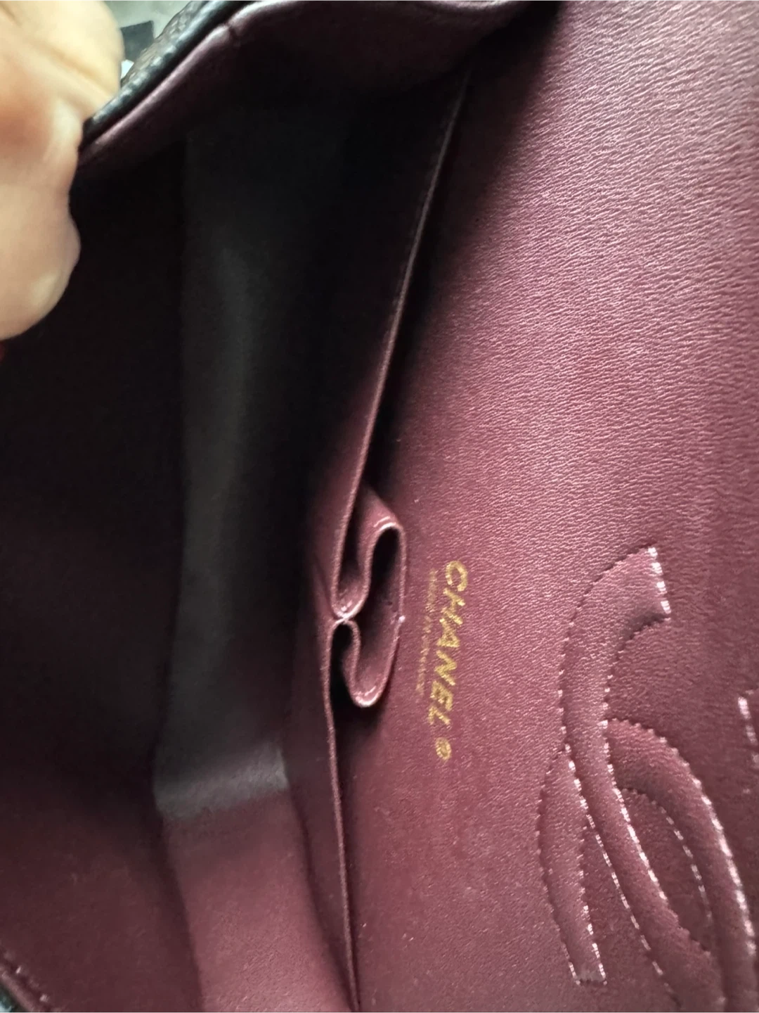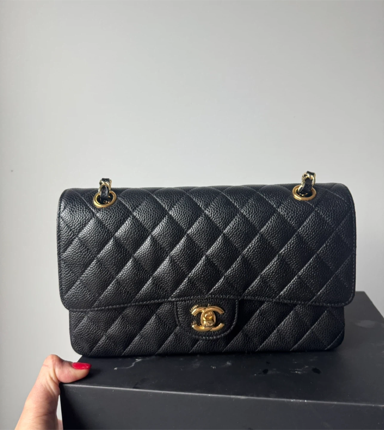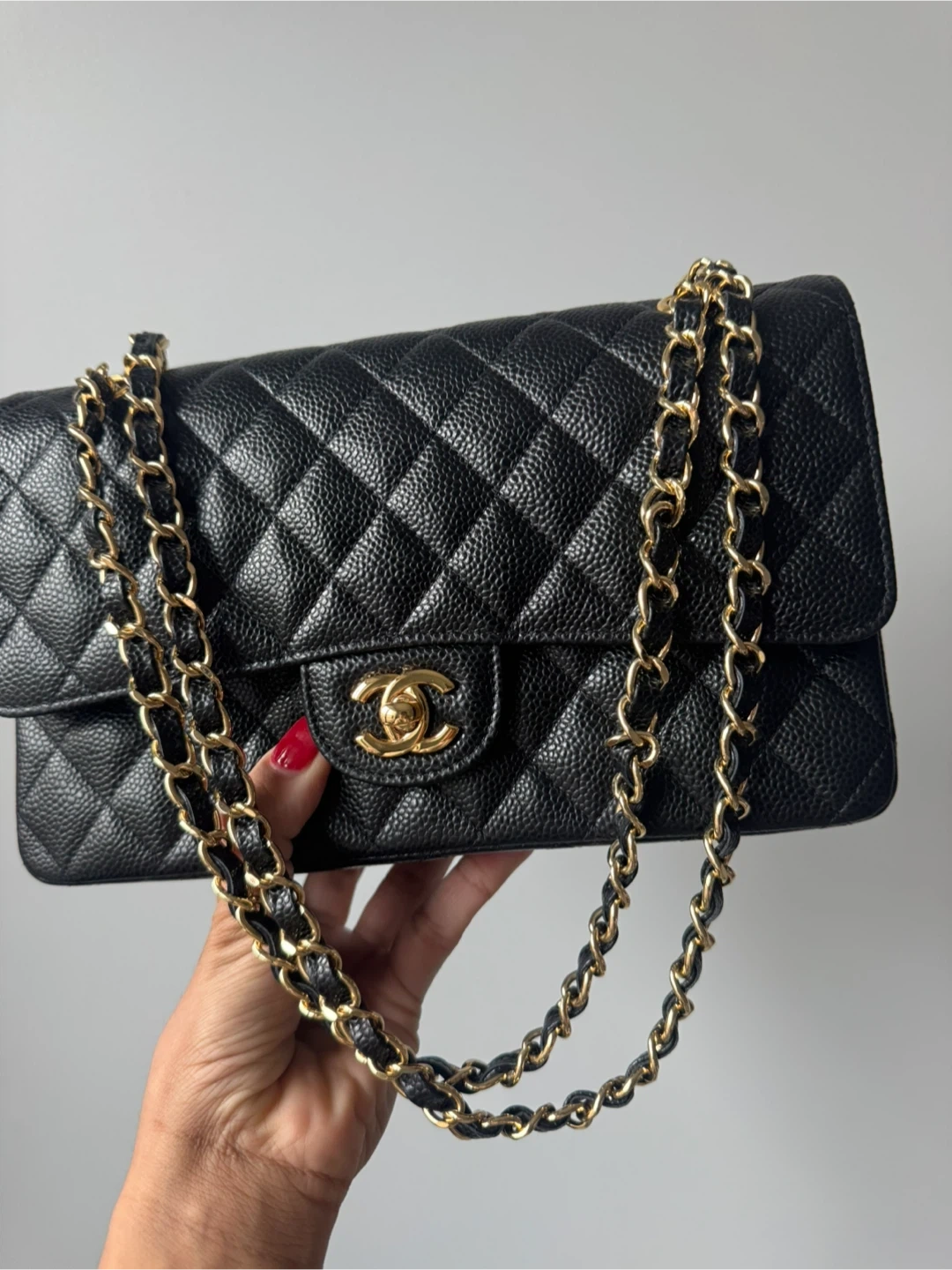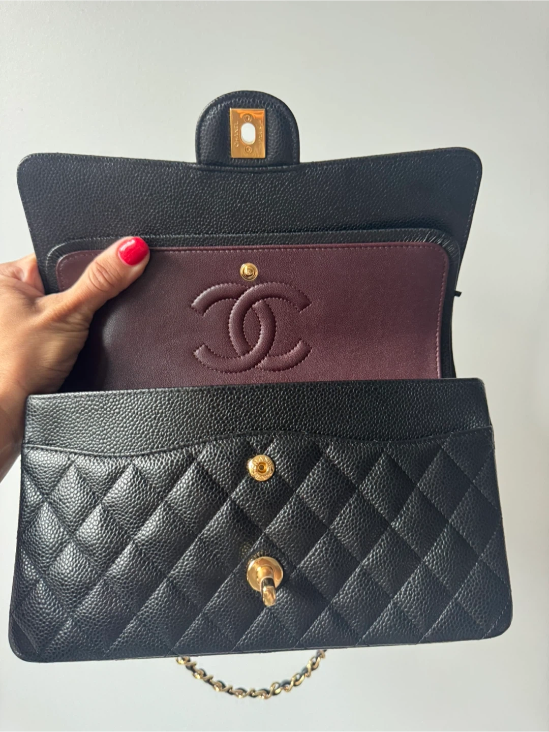 Classic inspired black caviar leather Chanel flap bag with gold hardware. Features the iconic quilted pattern and signature interlocking CC logo. Interior is a deep burgundy. This bag is a timeless accessory for any occasion!