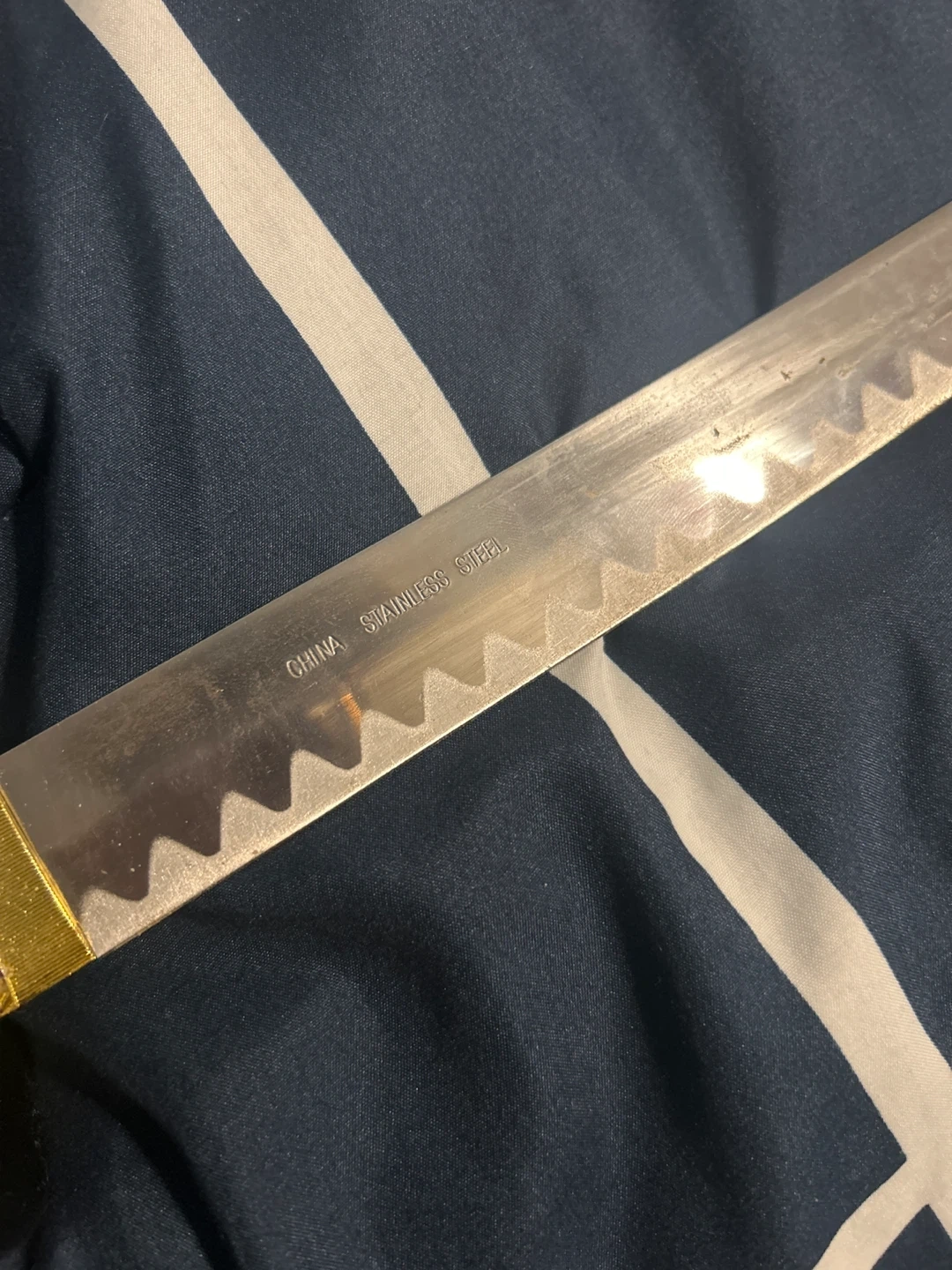 This is a decorative katana sword. It's made of stainless steel with a black scabbard. The handle is wrapped in a black and white pattern. It comes with a matching black scabbard.