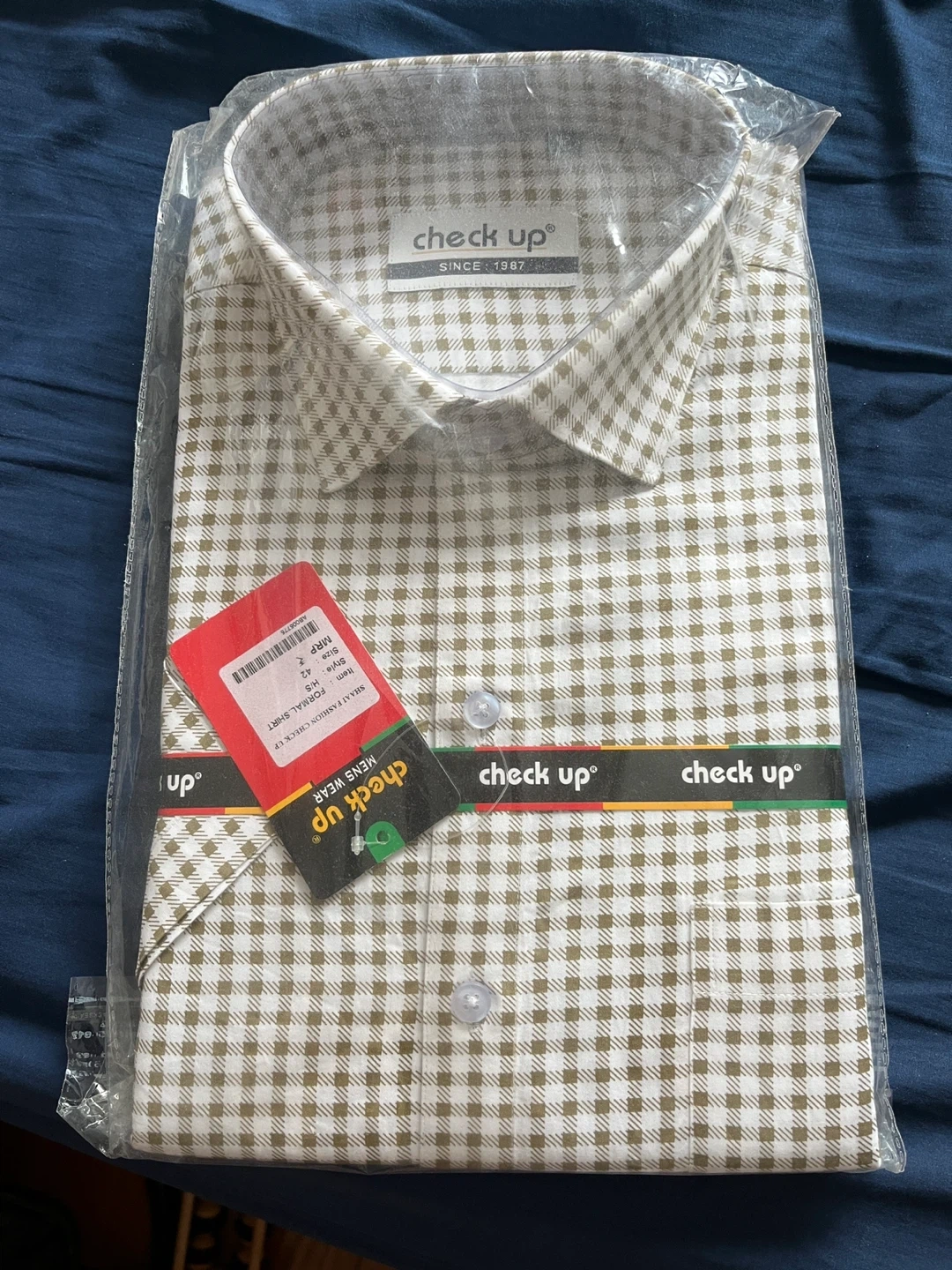 Two formal shirts from Check Up. One is a plaid pattern in blues and greys, and the other is a small checkered pattern in tan and white. Both are made of luxury cotton. This is men's wear, size H:S and 42.