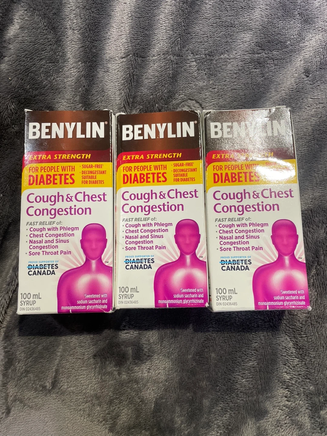 Benylin Extra Strength Cough & Chest Congestion Syrup is sugar-free and decongestant suitable for diabetics. It provides fast relief for cough with phlegm, chest congestion, nasal and sinus congestion, and sore throat pain. Each bottle contains 100 mL of syrup. Expiry date is 2026/08.