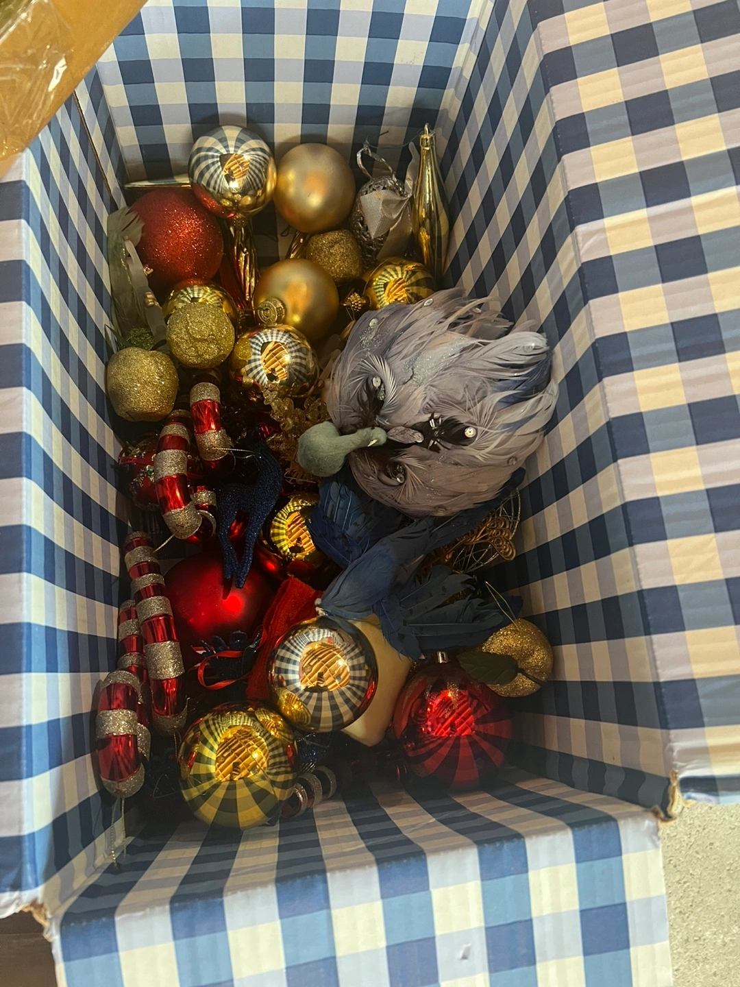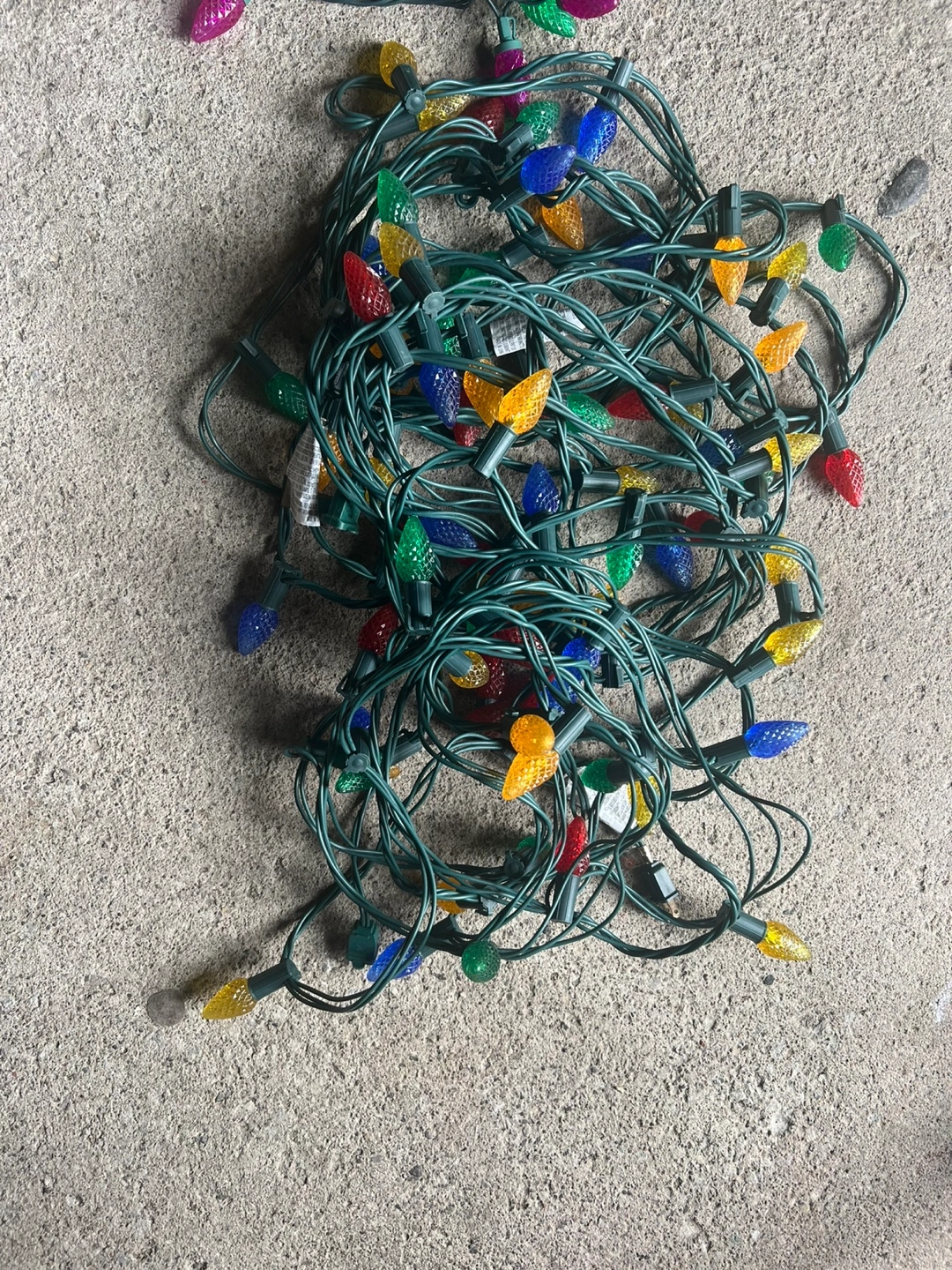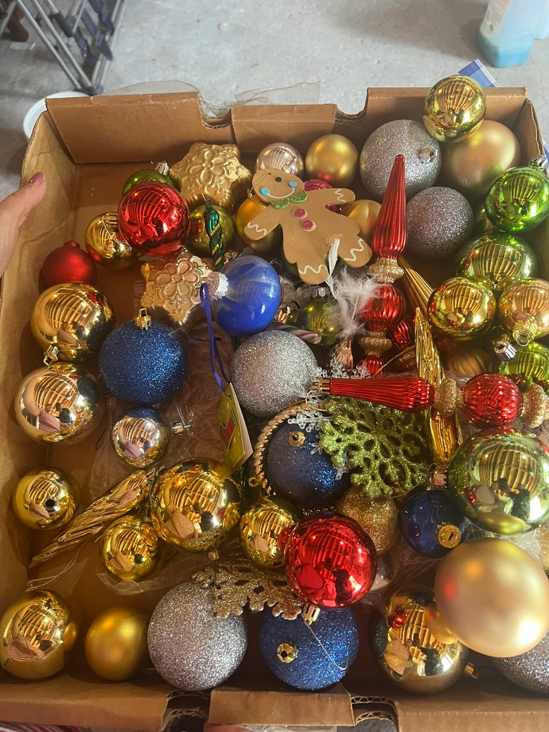 Multicoloured Christmas lights, various colours and styles. Includes a box of assorted ornaments; red, gold, blue, silver, and green. Perfect for decorating your tree this holiday season!