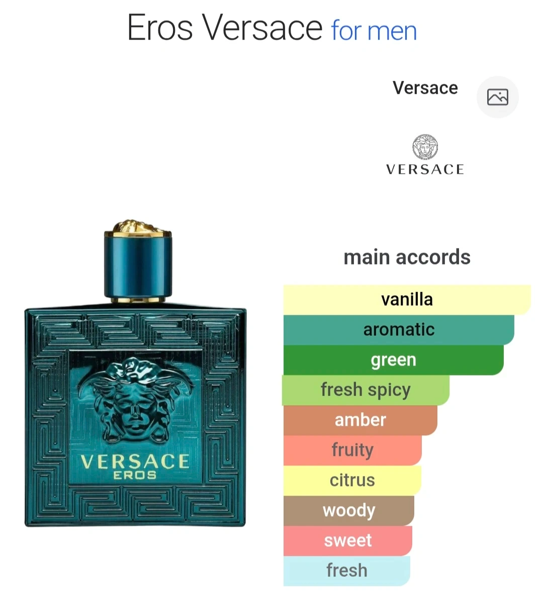 This is a 100mL bottle of Versace Eros Eau de Toilette. This fragrance features notes of vanilla, aromatic, green, and citrus. It's ideal for evening wear or special occasions.