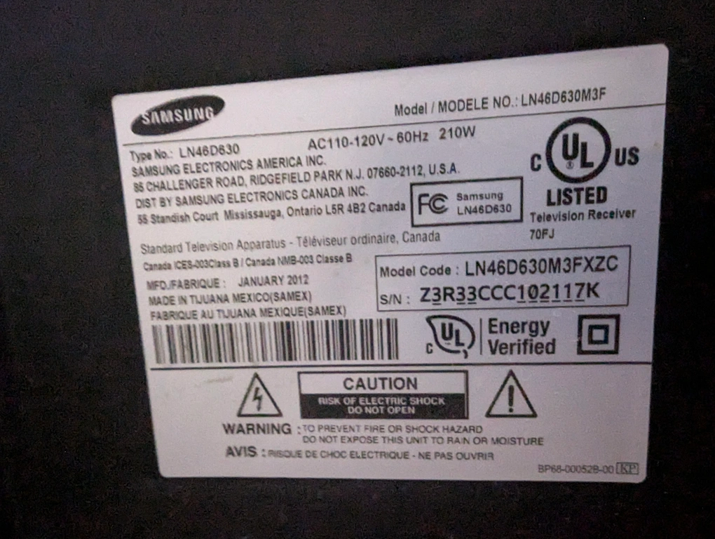 46 inch Samsung TV with multiple input options, including HDMI, Optical ARC and component inputs.