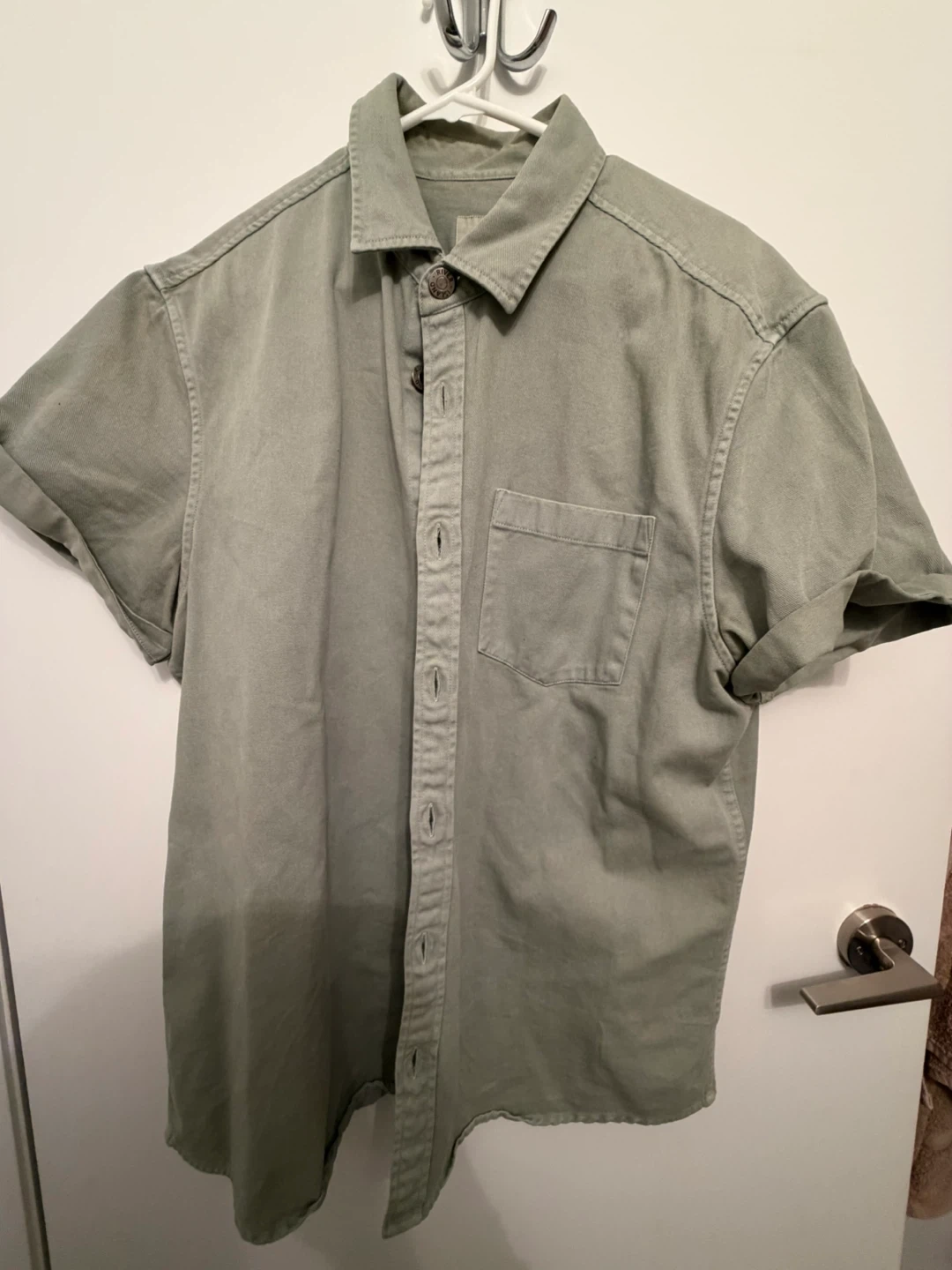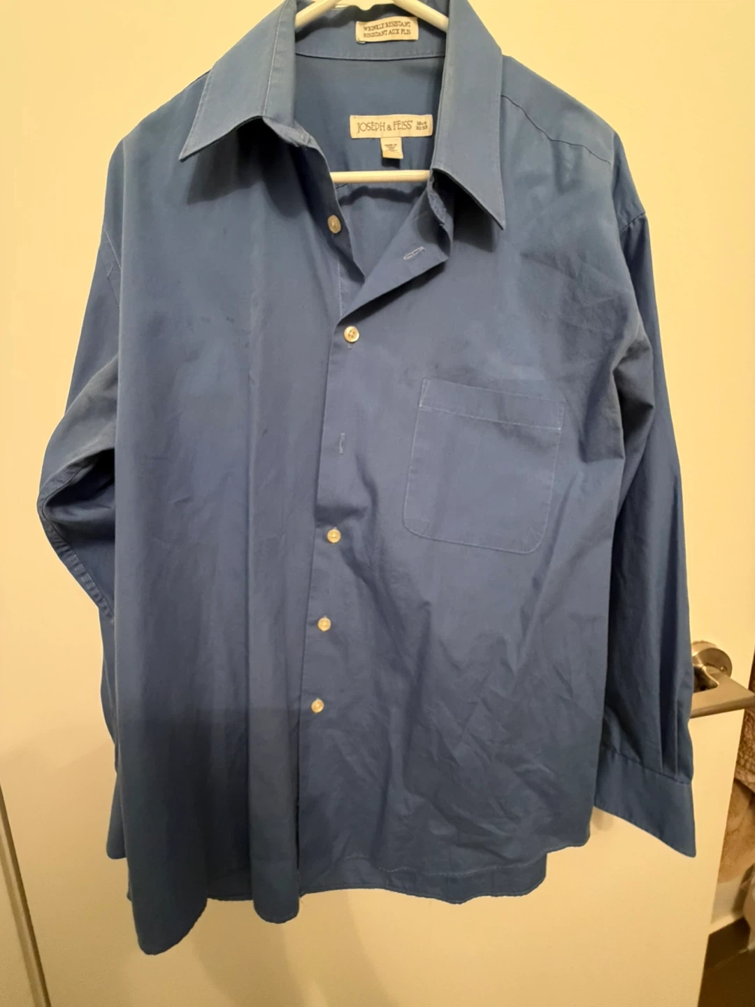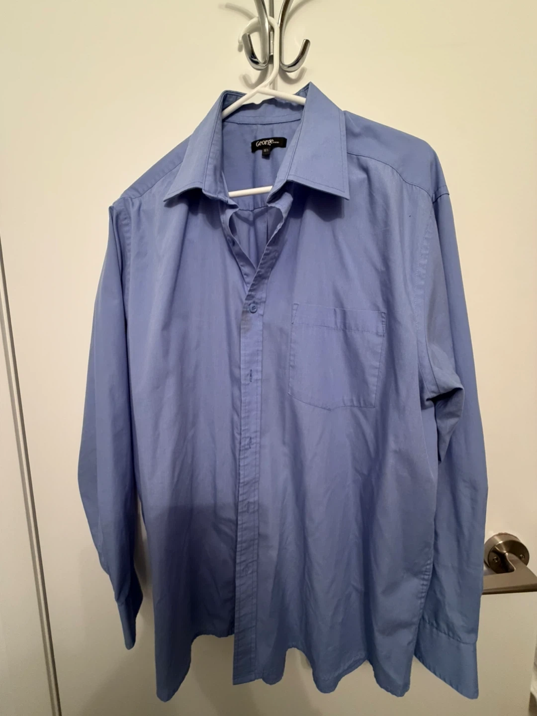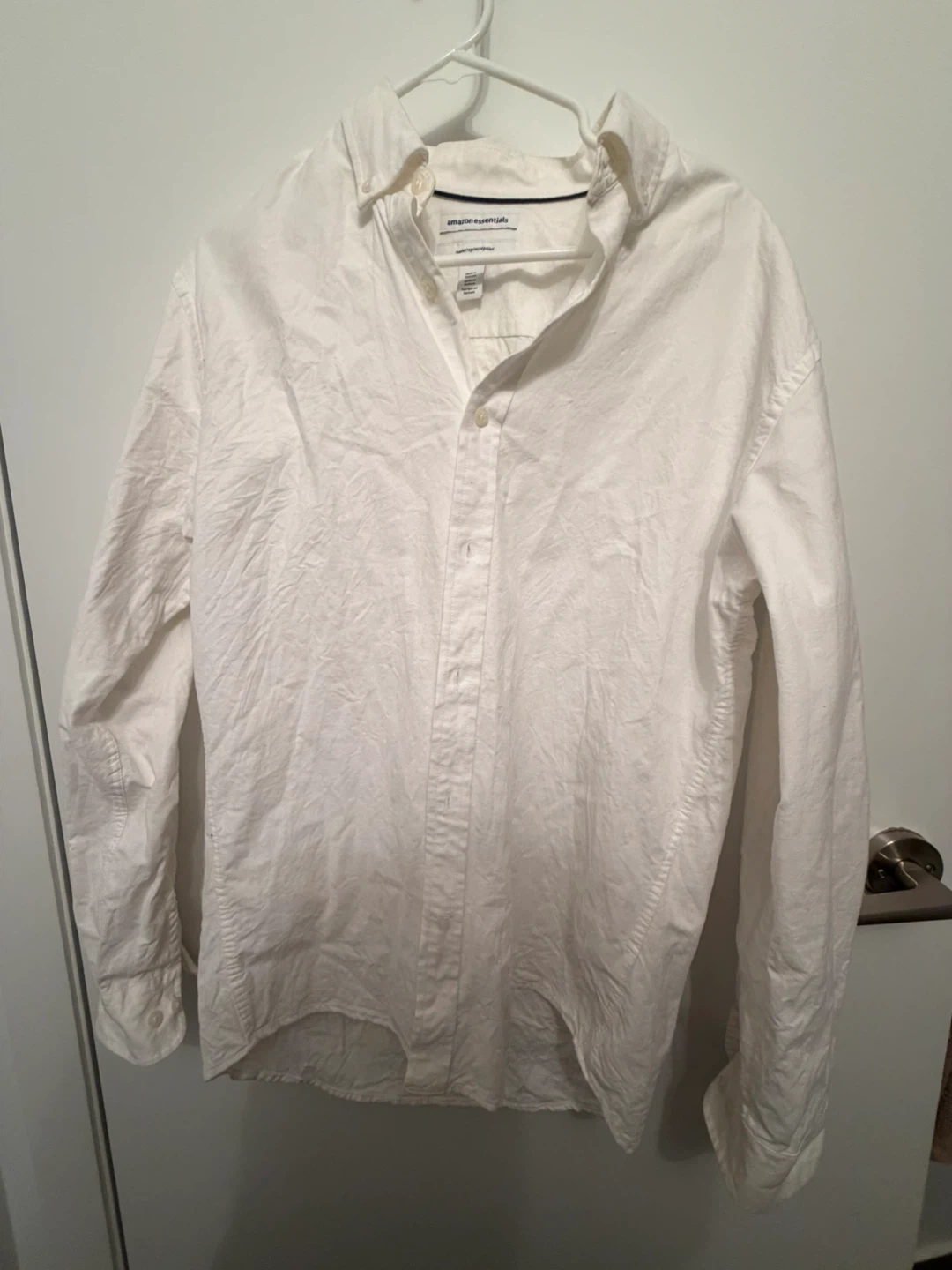 Bundle of four men's dress shirts. Includes a short-sleeve olive green shirt, a periwinkle blue dress shirt by George, a white casual button-up by Amazon Essentials, and a blue button-down shirt by Joseph & Feiss.