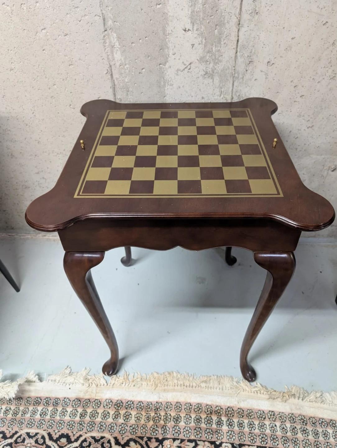 This is a beautiful dark wood chess and backgammon table! It's in perfect condition and would be a lovely addition to any game room or living space.