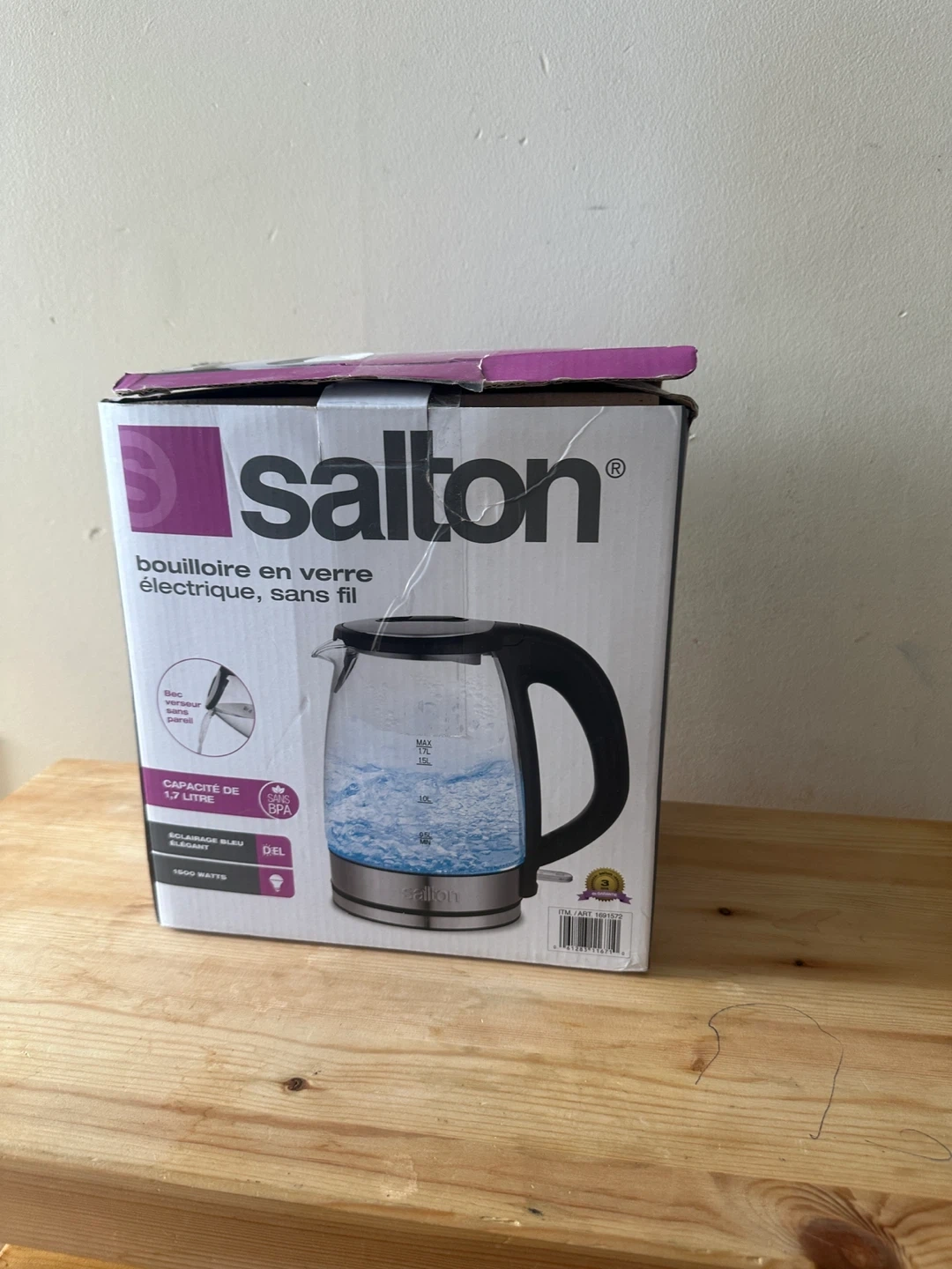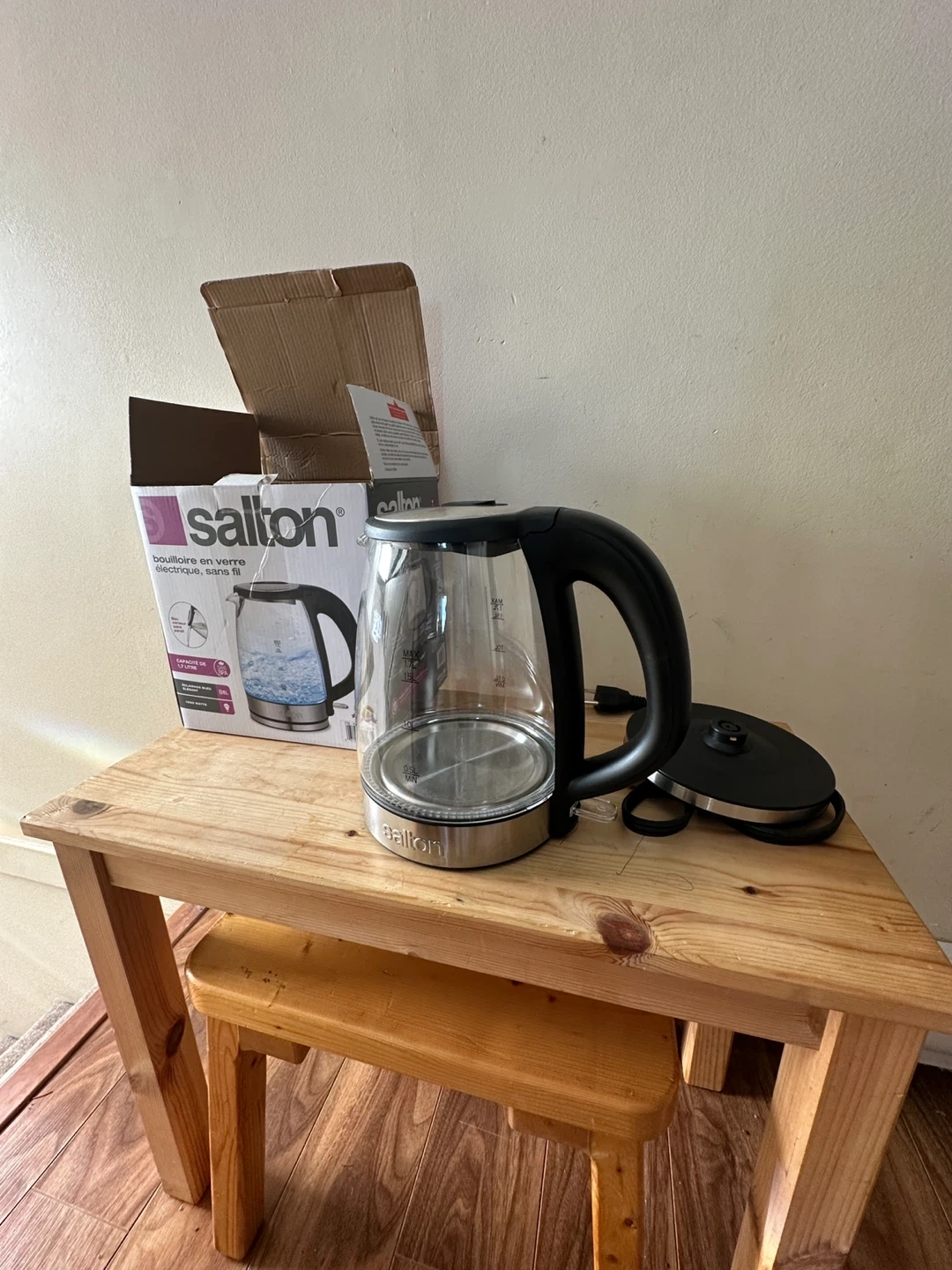 This Salton electric kettle features a glass body and holds up to 1.7 litres. It's cordless and has a 1500 watt heating element. Original box included. The price is nonnegotiable.