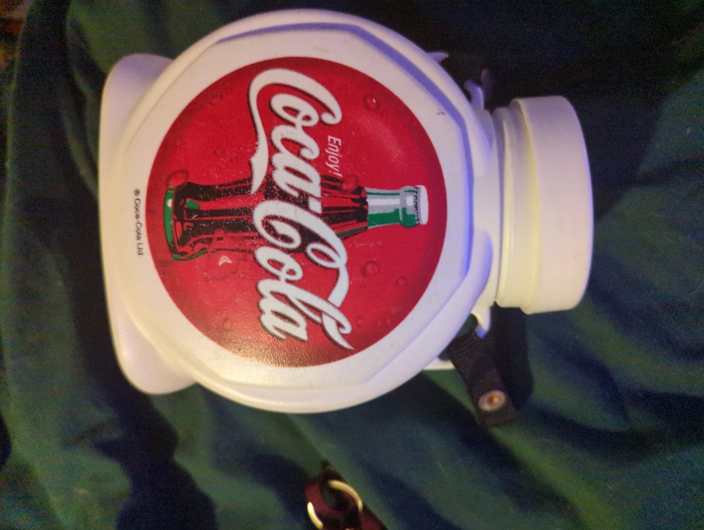 This is a white plastic container featuring the classic Coca-Cola logo and bottle design. It has a black strap attached. It's great for storing small items.