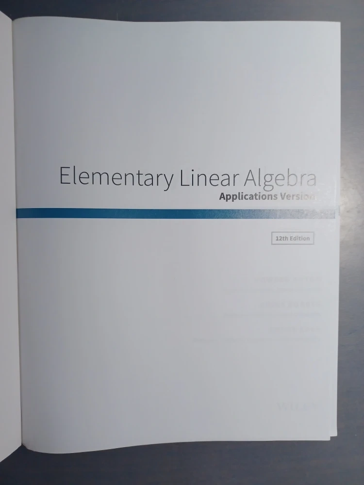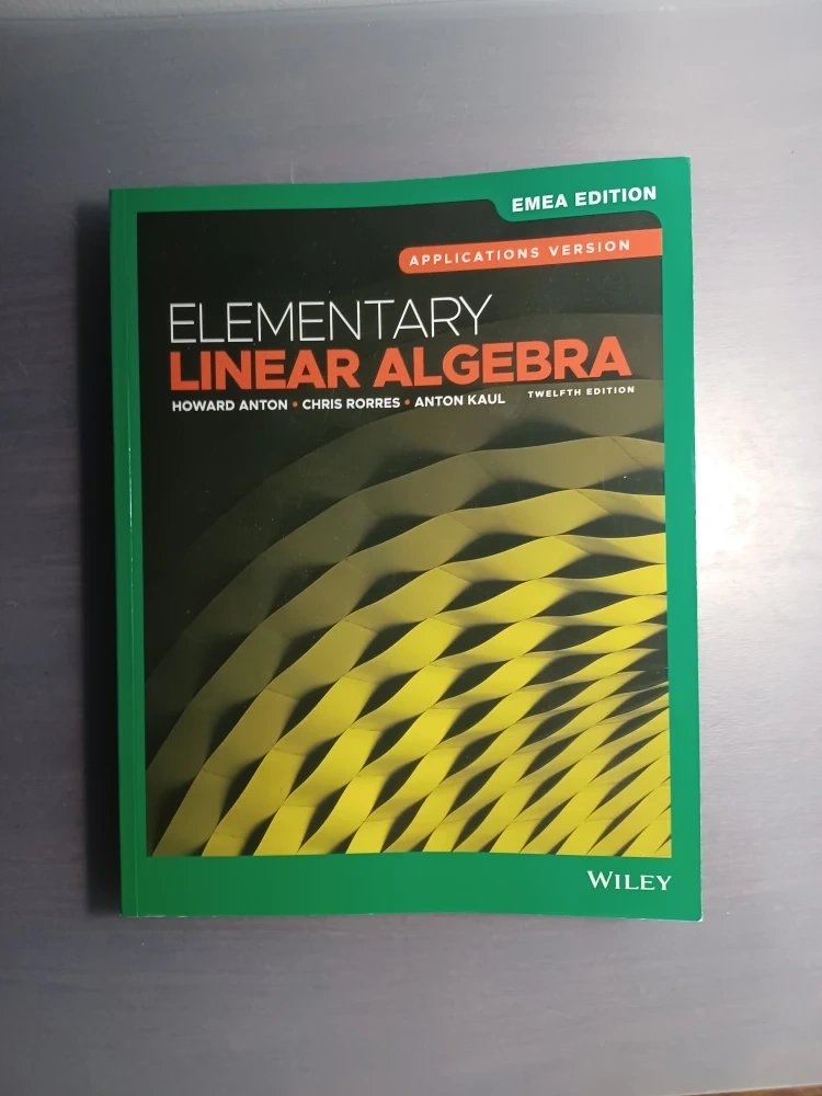 Open to offers. Selling a pristine never-used copy (I bought it online, then I changed courses) of Elementary Linear Algebra, Applications Version, 12th Edition by Howard Anton, Chris Rorres, and Anton Kaul. Great for students studying linear algebra!