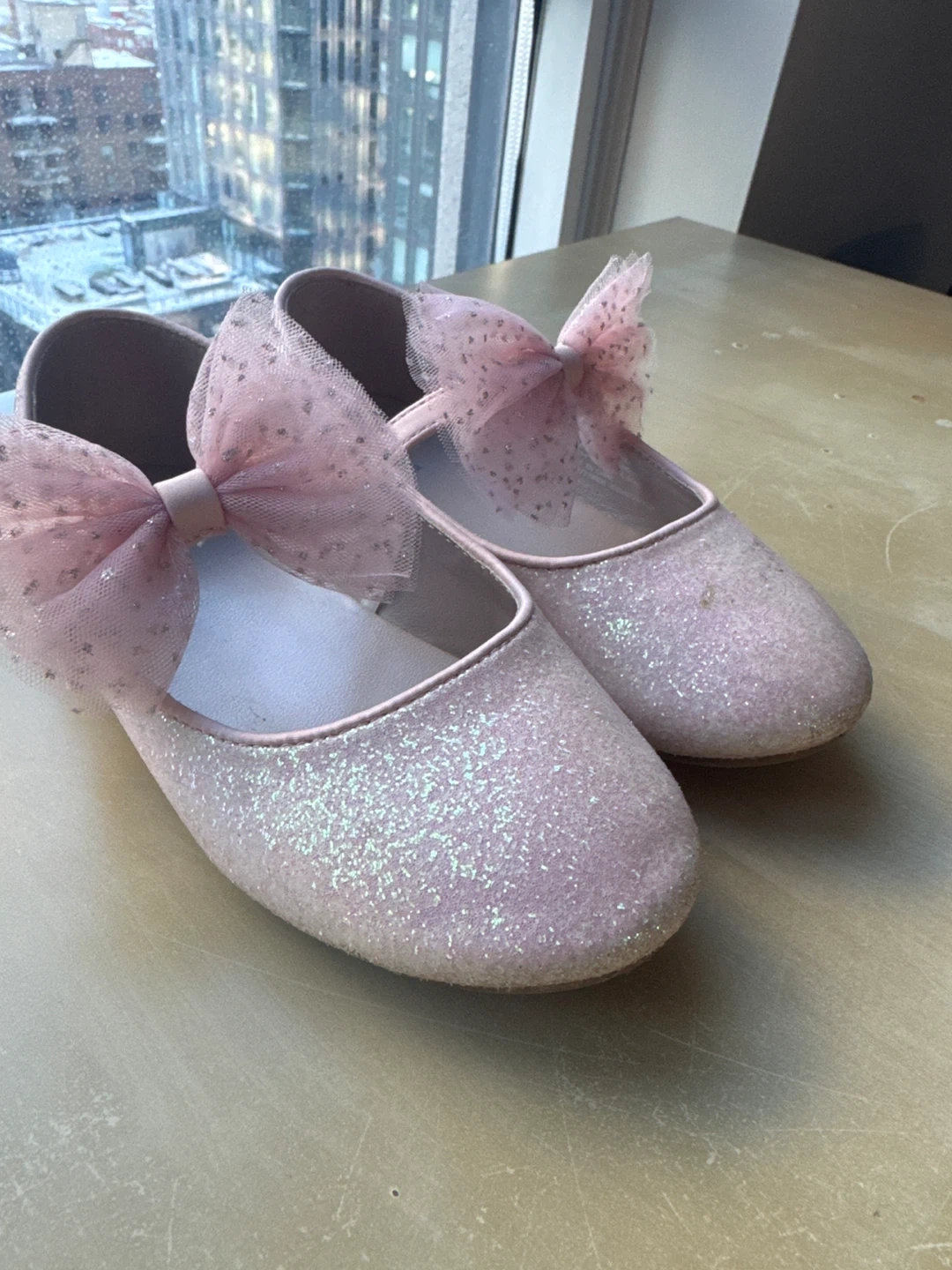 These cute pink glitter Mary Janes are from Gymboree. They're a size 10 and feature a sparkly glitter finish with a delicate tulle bow on each shoe. Non-marking soles. Buy a pair get a pair free.