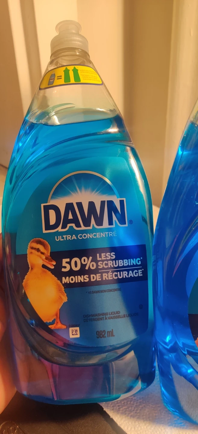 3 Dawn Ultra Concentrated dishwashing liquid. It's 50% less scrubbing than non-concentrated formulas. Each bottle contains 982 ml.