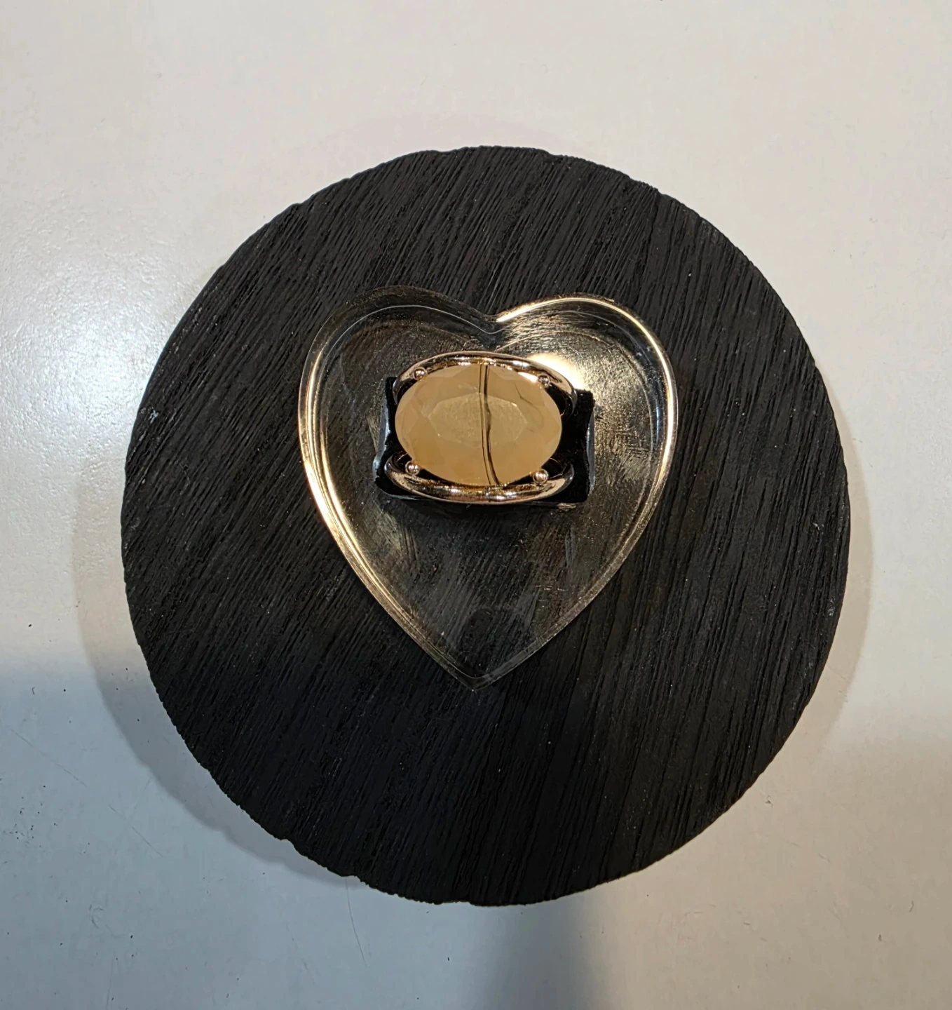 This vintage ring features an oval amber-colored ring set in a gold-toned metal. The band is designed with a split detail. It's presented on a textured black heart-shaped base.