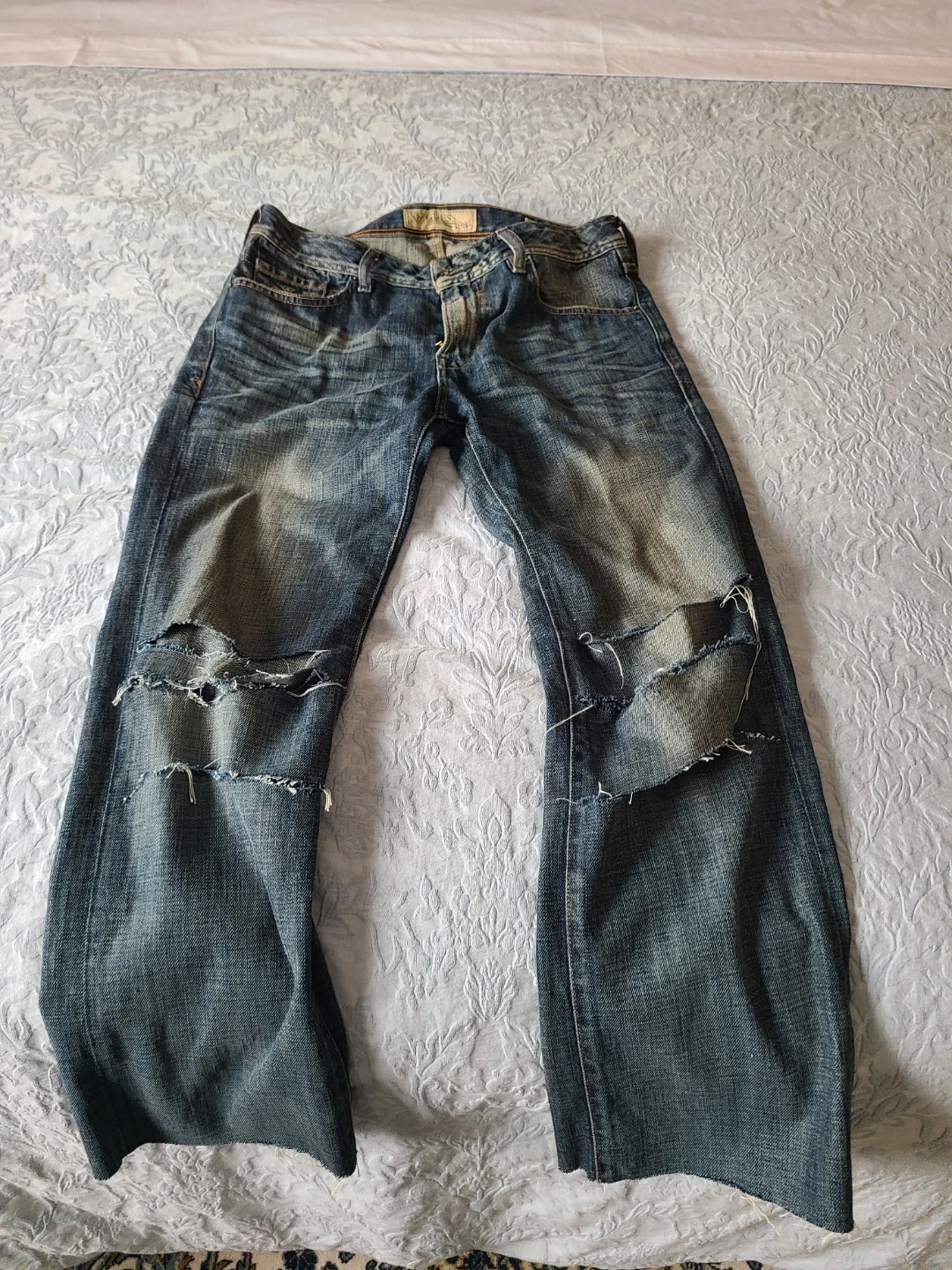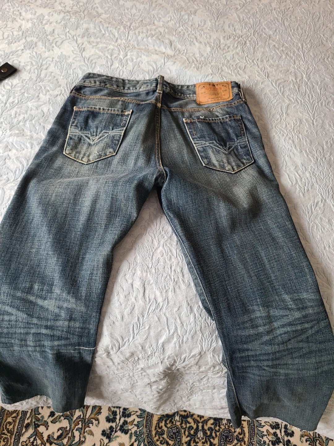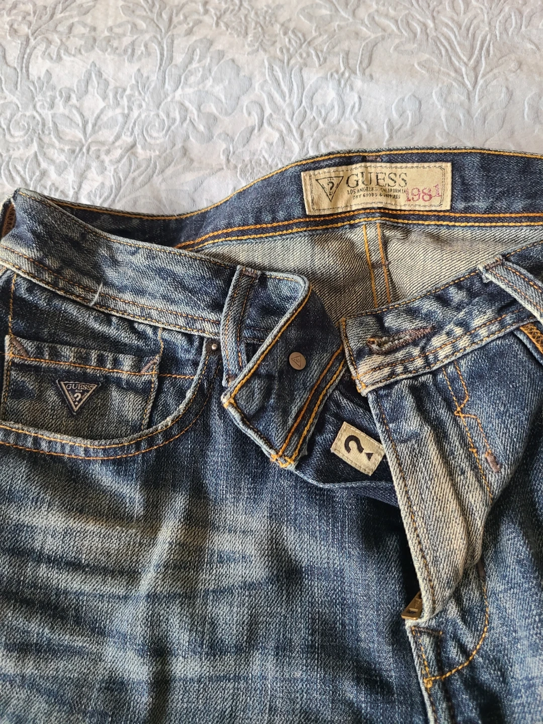 Selling a pair of Guess 1981 jeans in a size 31. They have a distressed look. The material is 100% cotton.