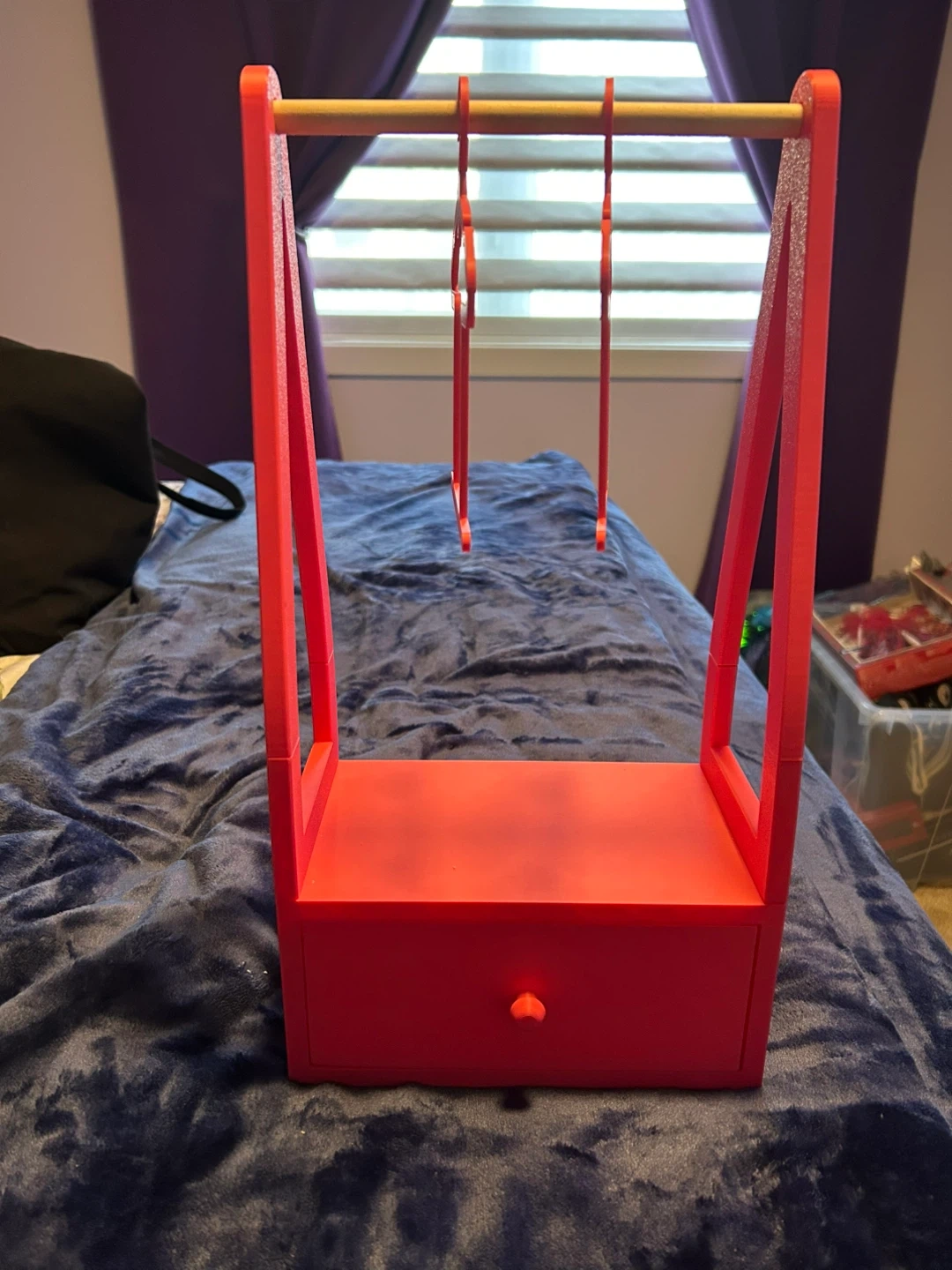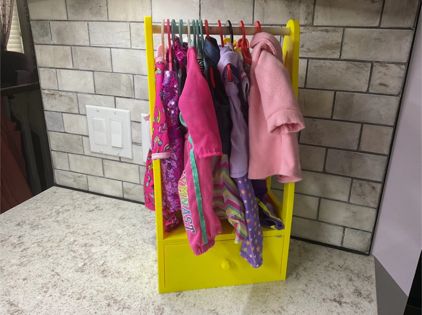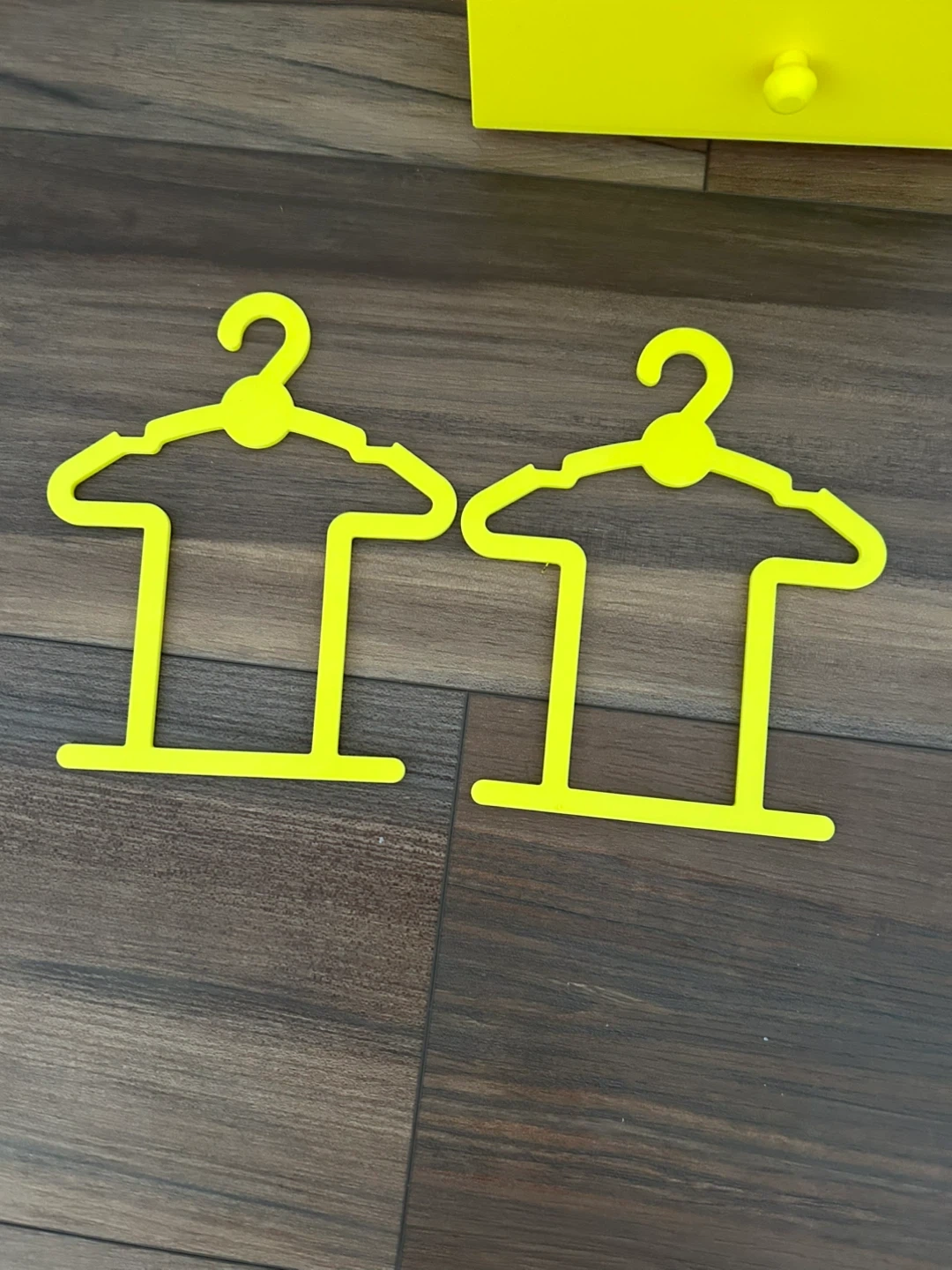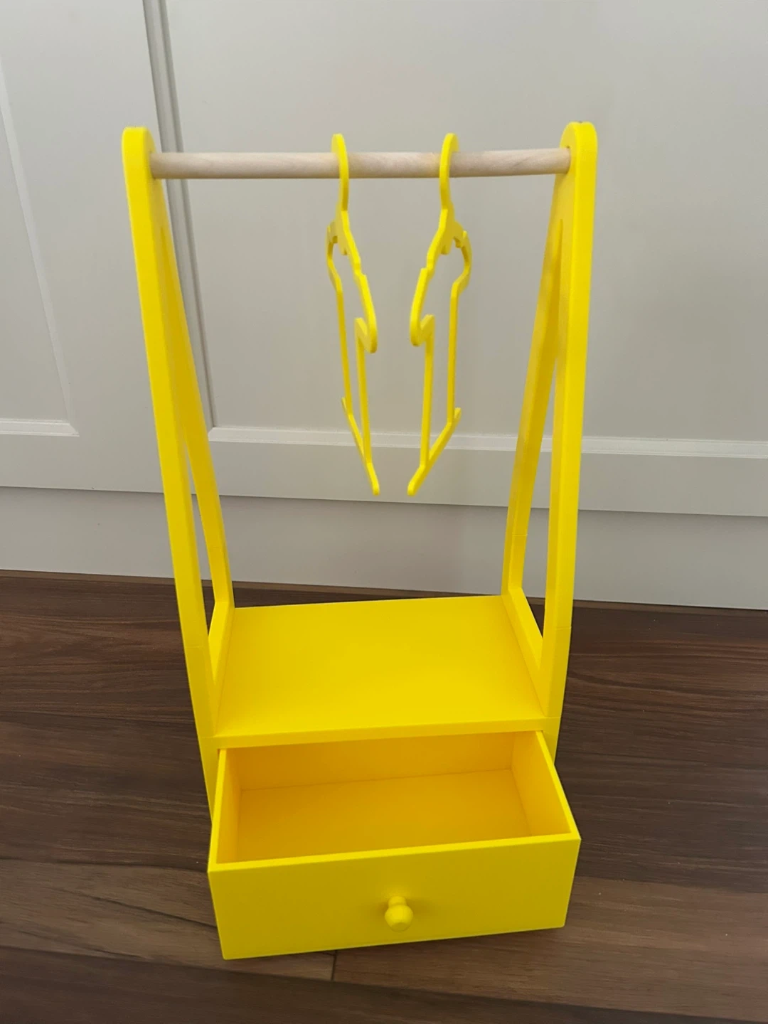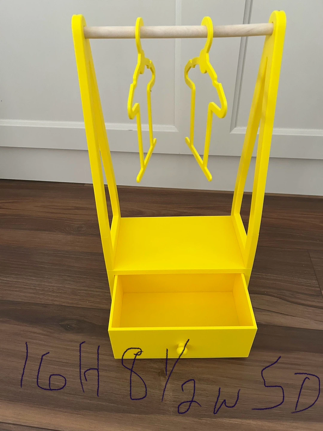 Here's a cute 3D printed clothing rack for dolls clothes! My granddaughter lives her for her My Life dolls. It comes with two matching yellow hangers.. extra hangers are $1 each or 5 for $4. The dimensions are approximately 16 inches high, 8.5 inches wide, and 5 inches deep. Perfect for organizing doll clothes or other small items