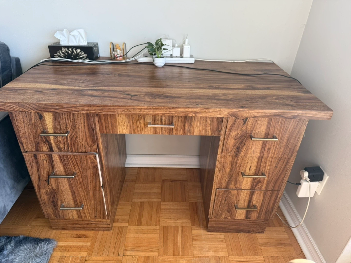 A sturdy wooden desk featuring multiple drawers for storage. Its rich wood grain pattern adds a warm touch to any home office. This desk is perfect for organizing your workspace and keeping essentials close at hand.