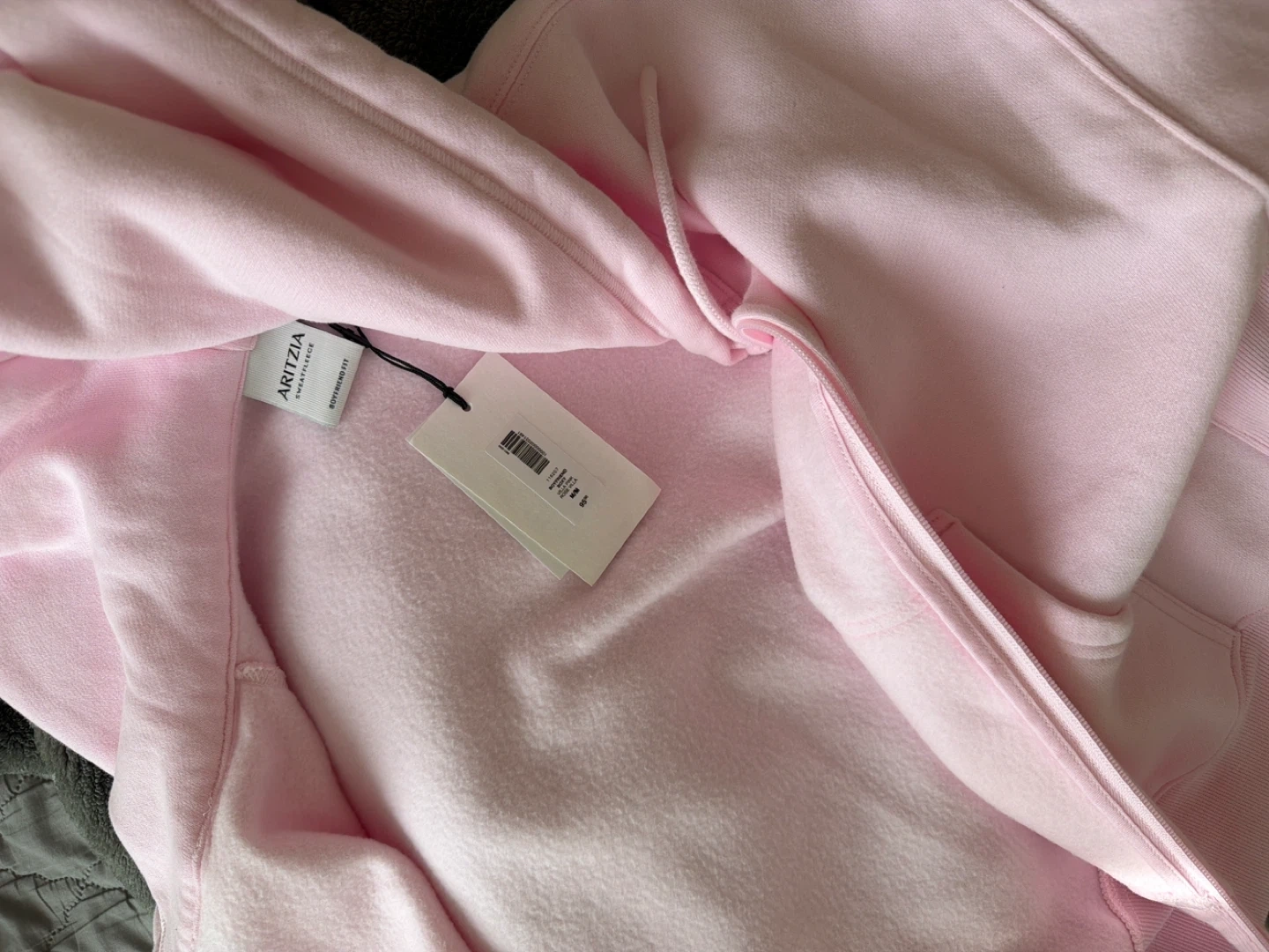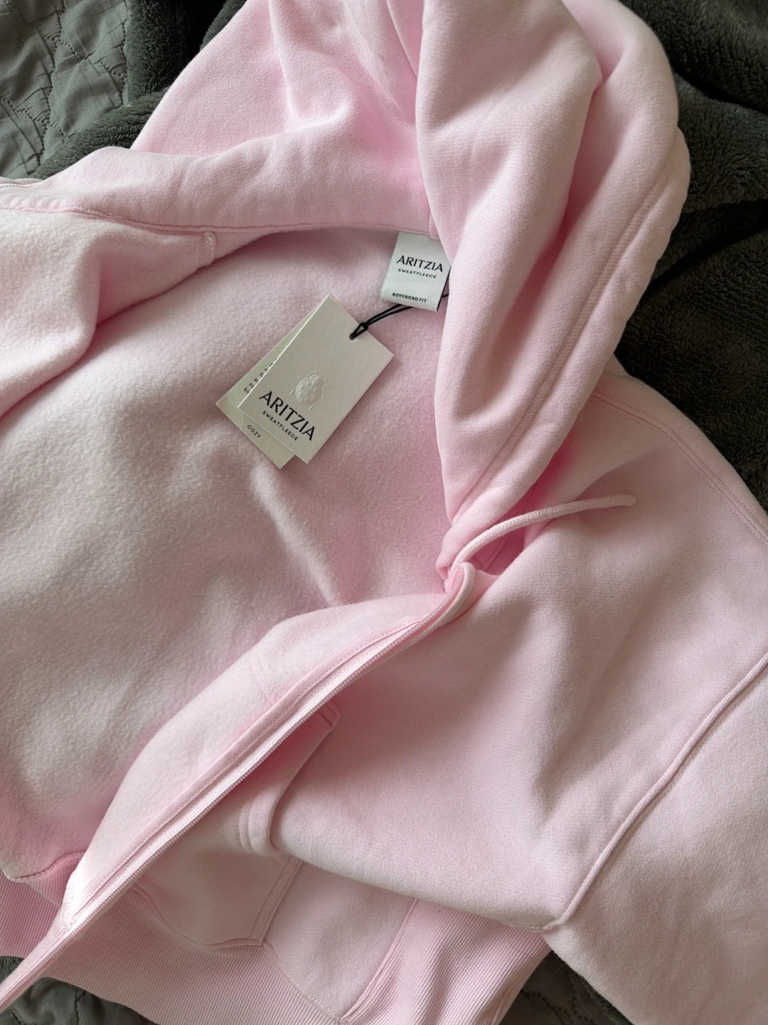 This Aritzia hoodie is made with cozy sweatfleece material. It's a classic fan-favourite fleece pullover style. It's a zip-up hoodie with a drawstring hood. It has a relaxed, boyfriend fit.