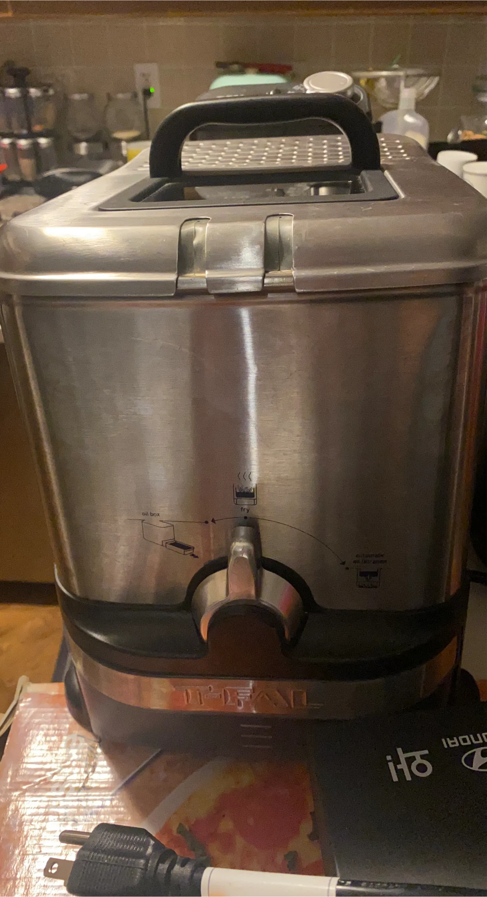 This is a T-fal stainless steel deep fryer. It features an oil box and automatic oil filtration. Makes frying quick and easy!