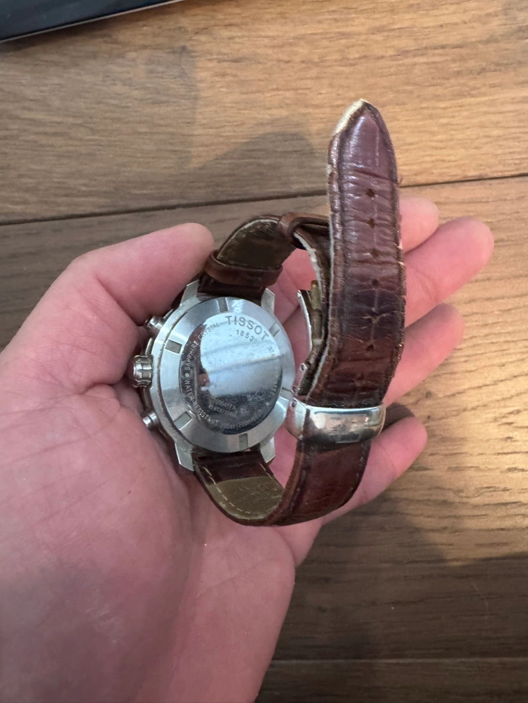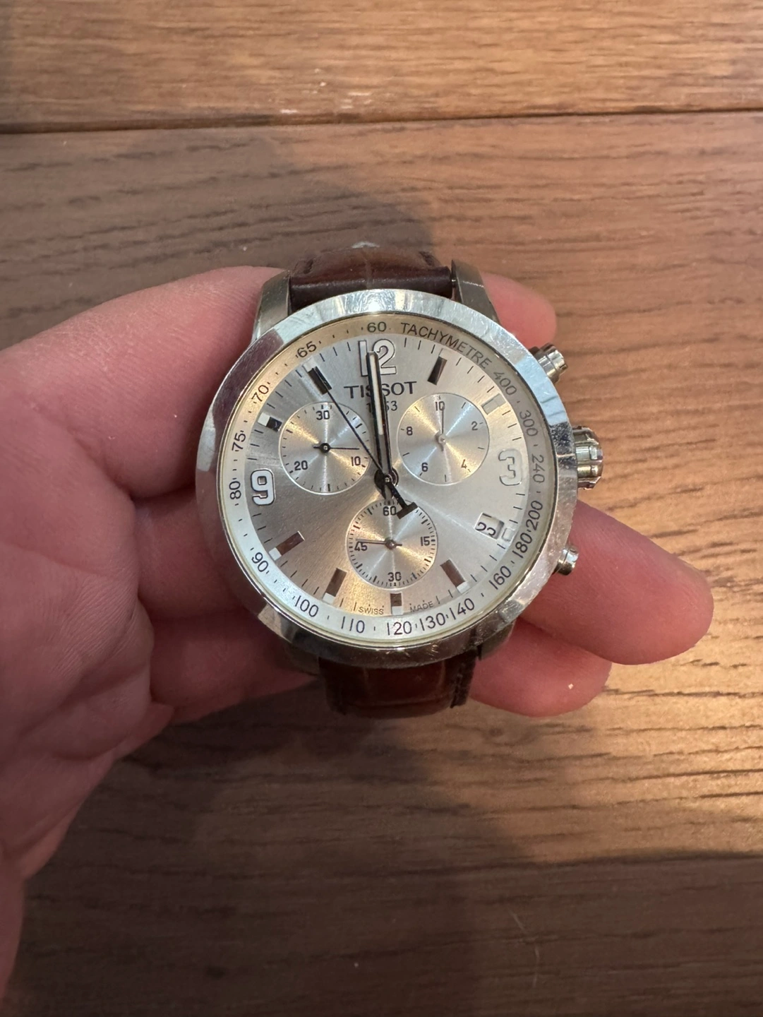 Pre-owned Tissot chronograph watch. Silver-toned face, brown leather band. Features chronograph functions and tachymeter bezel. Shows some signs of wear.