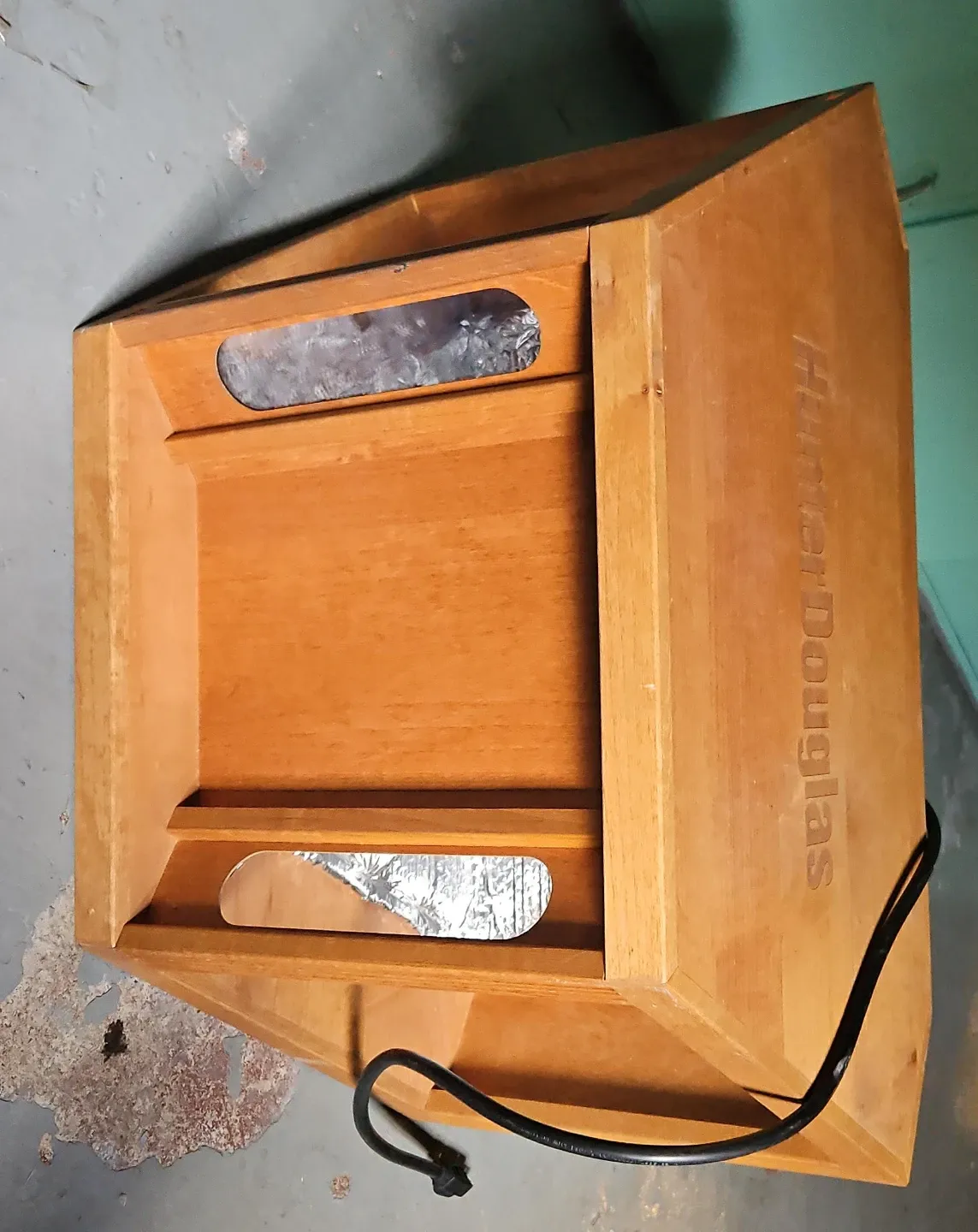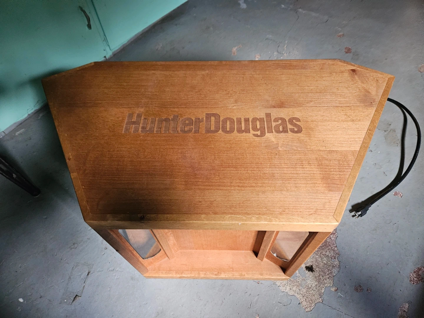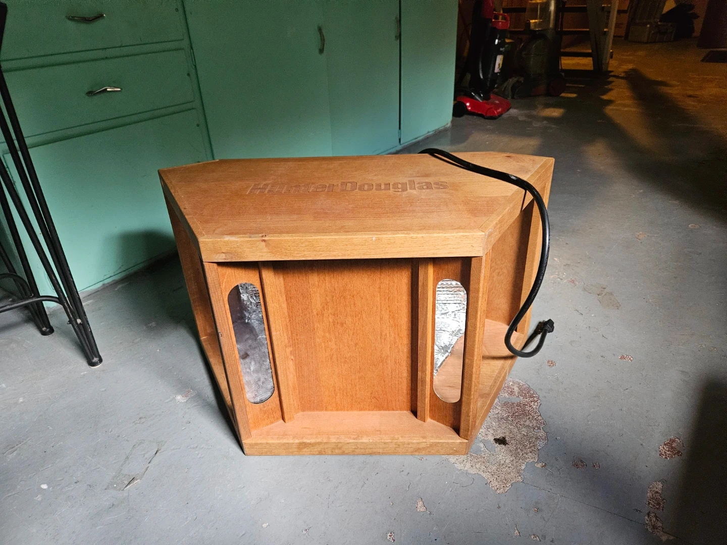 Hunter Douglas wooden lamp fixture. It's lined with a reflective material inside. Includes a power cord and an electrical outlet on the back with a switch.