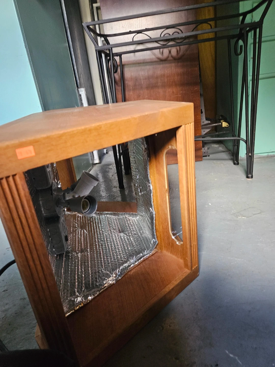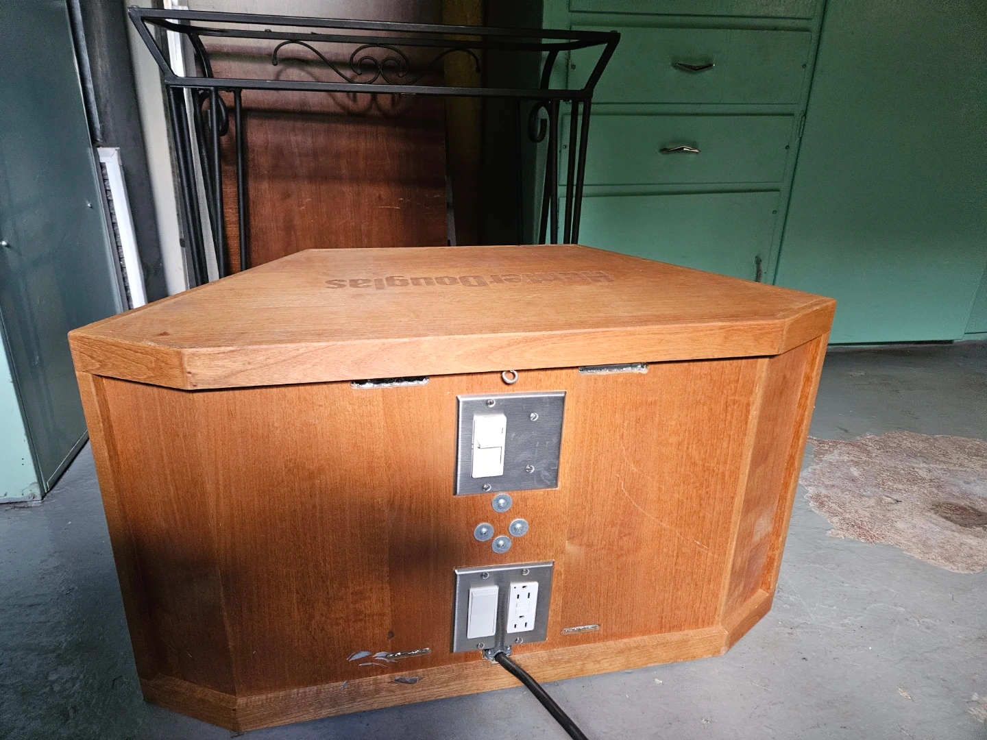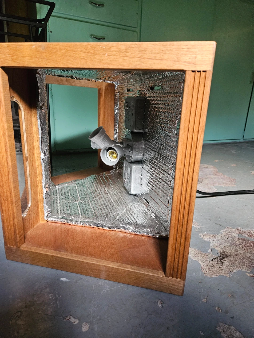 Hunter Douglas wooden lamp fixture. It's lined with a reflective material inside. Includes a power cord and an electrical outlet on the back with a switch.