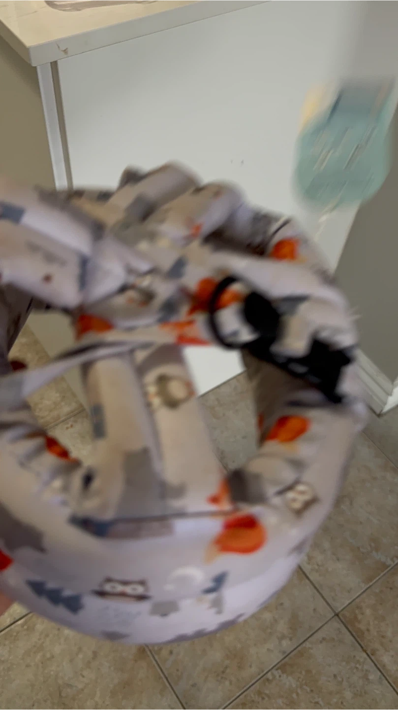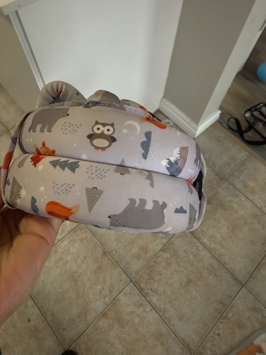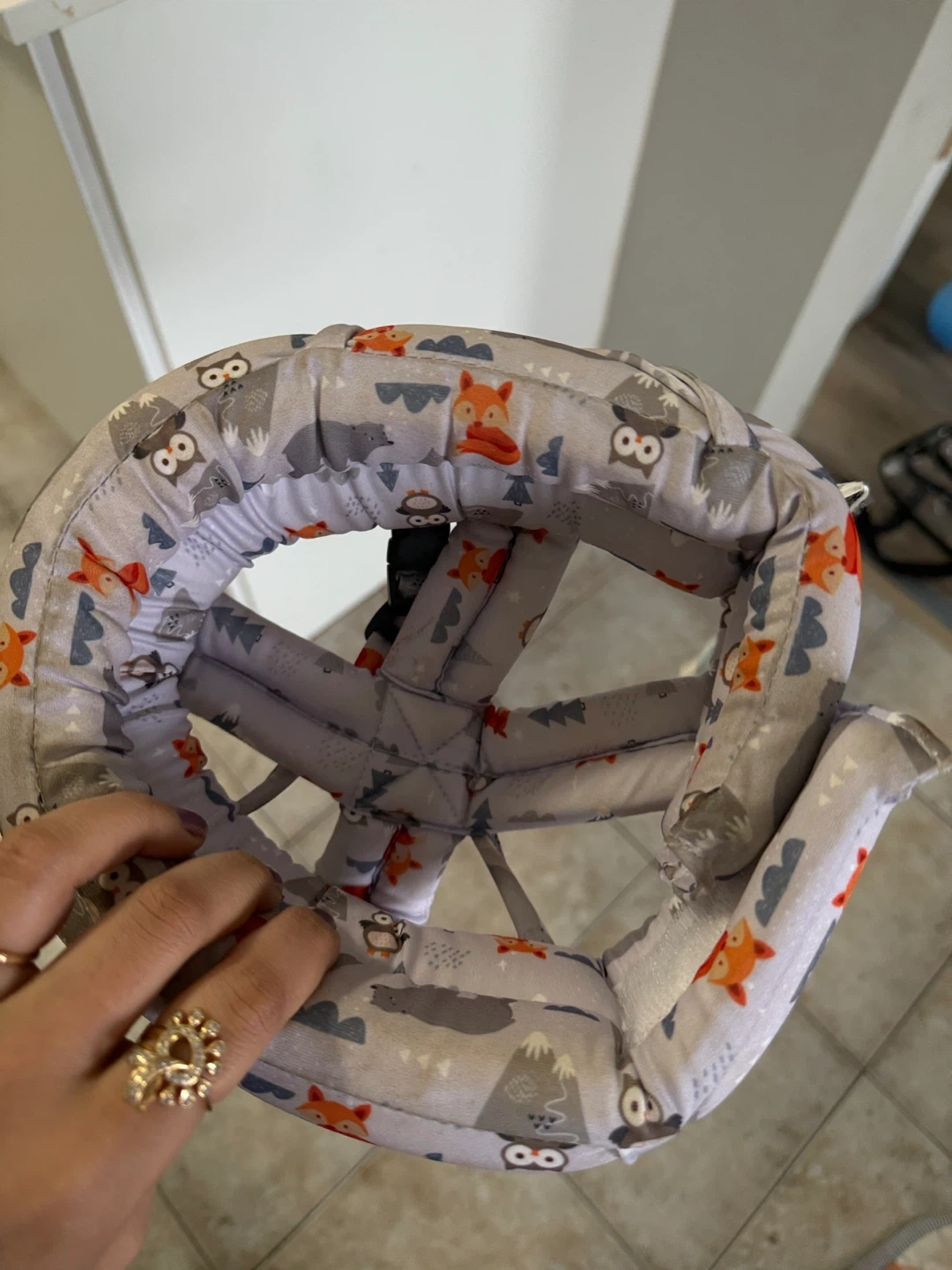 This baby head protection helmet features a cute grey pattern with foxes, owls, and bears. It's designed to offer cushioning and support for little ones learning to walk. Padded interior for comfort.