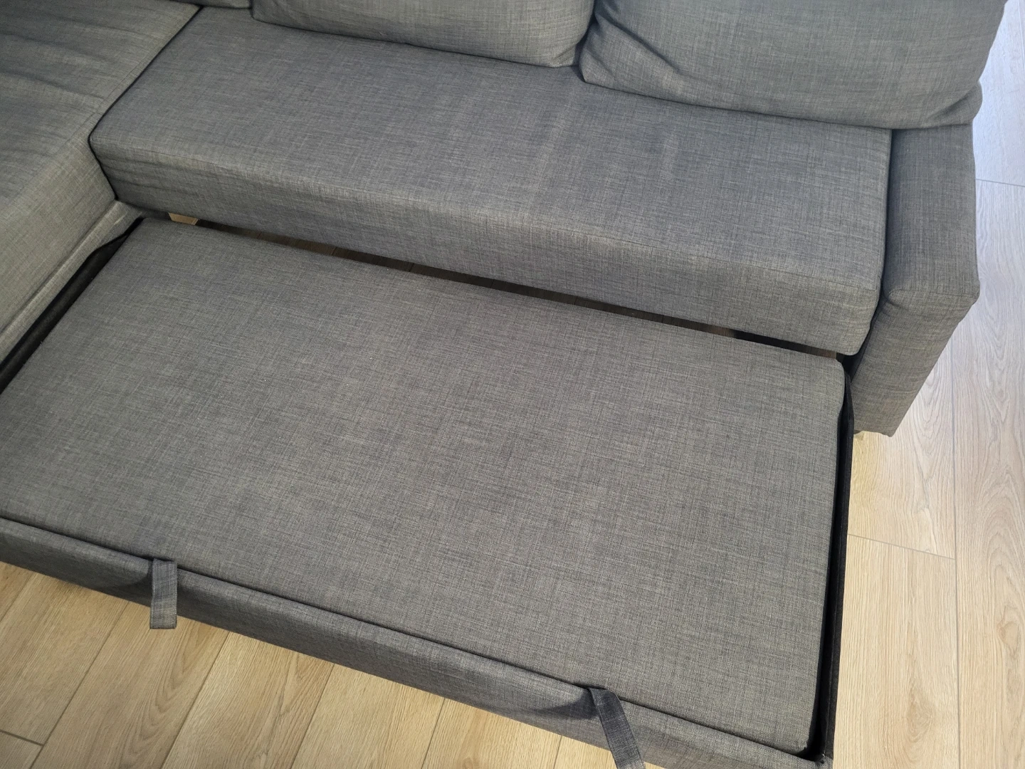 Comfortable, lightly-used grey sectional sofa with a pull-out bed feature. It's upholstered in a durable fabric. Perfect for small spaces needing extra sleeping arrangements! Could be great for dorms.