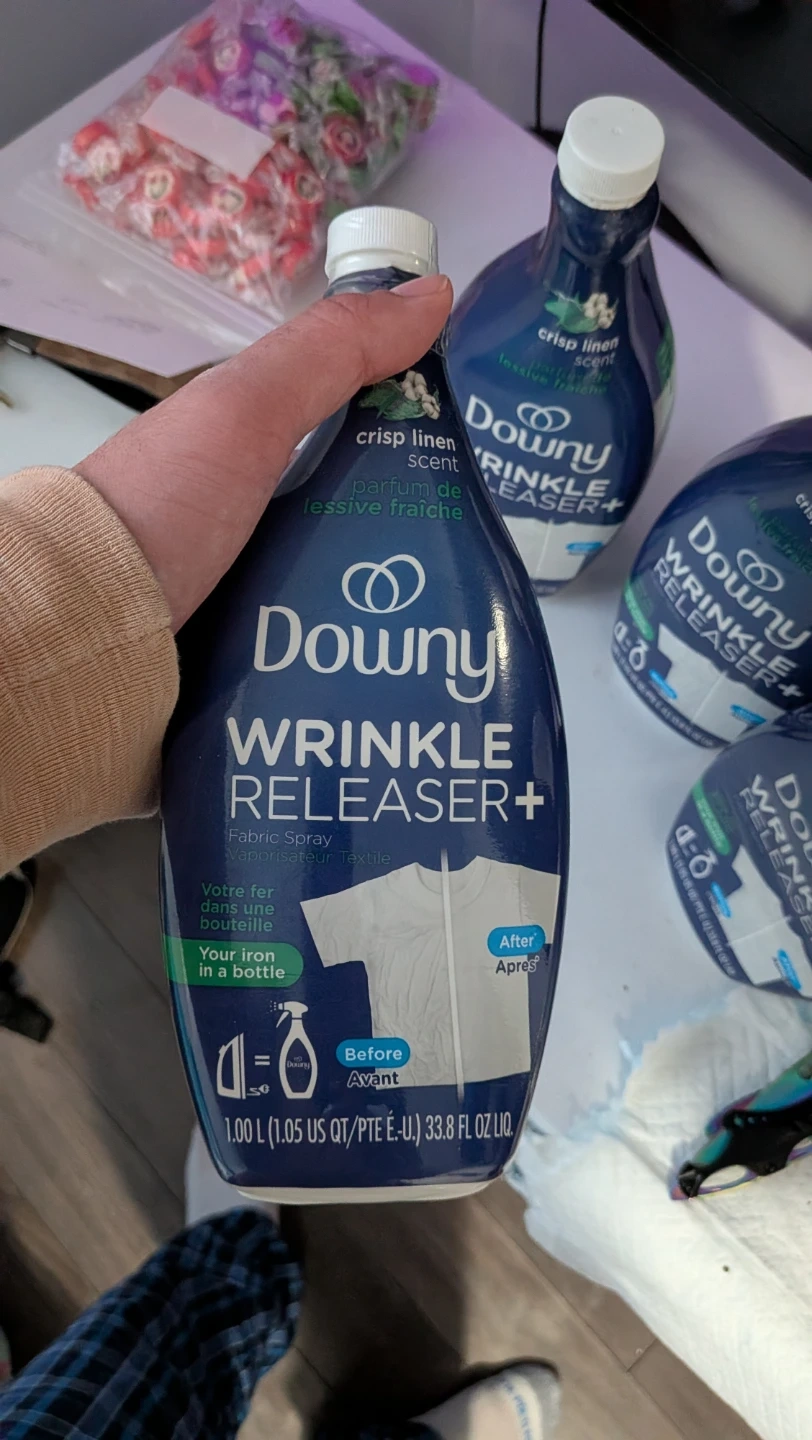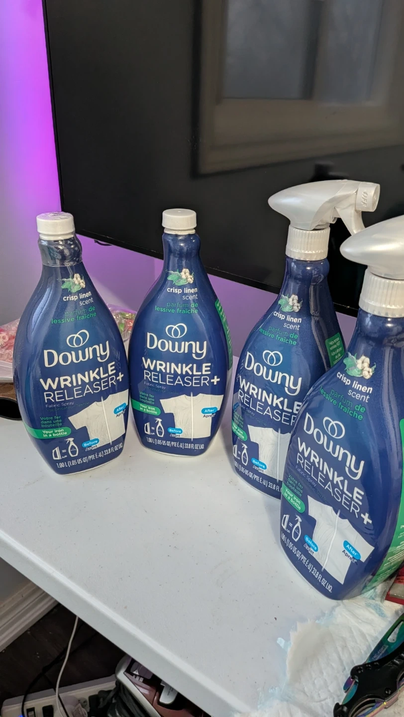I have 4 bottles of Downy Wrinkle Releaser+ with a crisp linen scent. It's your iron in a bottle! Each bottle contains 1.00 L (1.05 US QT/PTE É-U.) 33.8 FL OZ LIQ