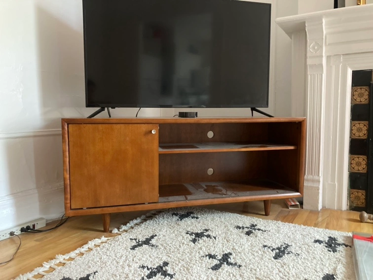 Mid century modern wooden TV stand with sliding door. TV NOT INCLUDED. Good amount of storage space and holes in back for outlets. Can fit up to 52in TV. Like new condition, no wear and tear. Just a bit dusty!