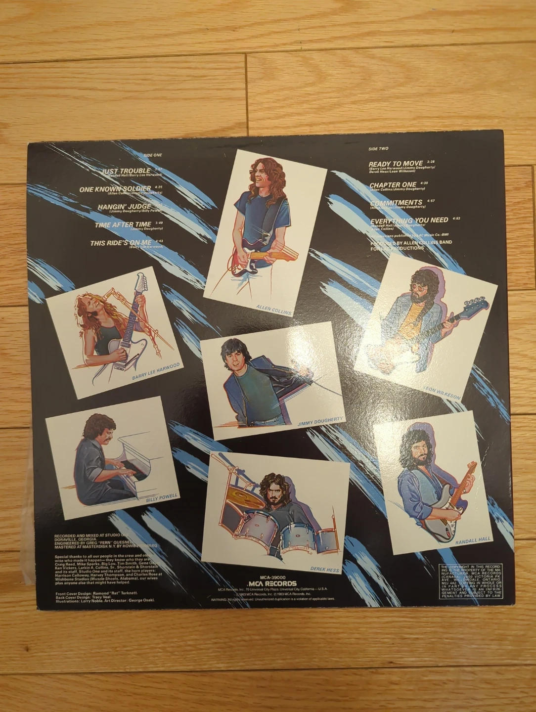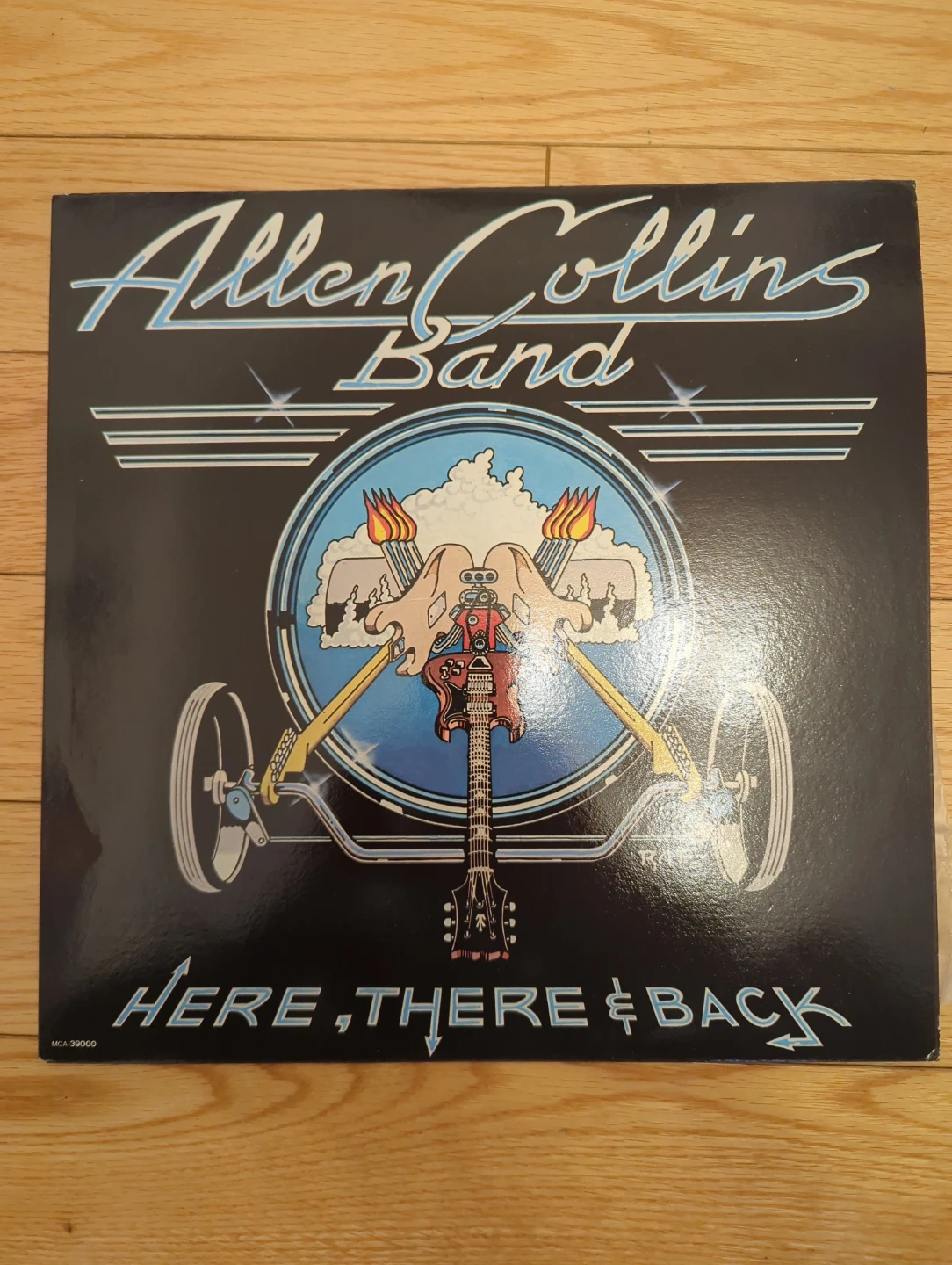 This is the vinyl record "Here, There & Back" by the Allen Collins Band. It features the original tracklist. MCA Records release, catalogue number MCA-39000.