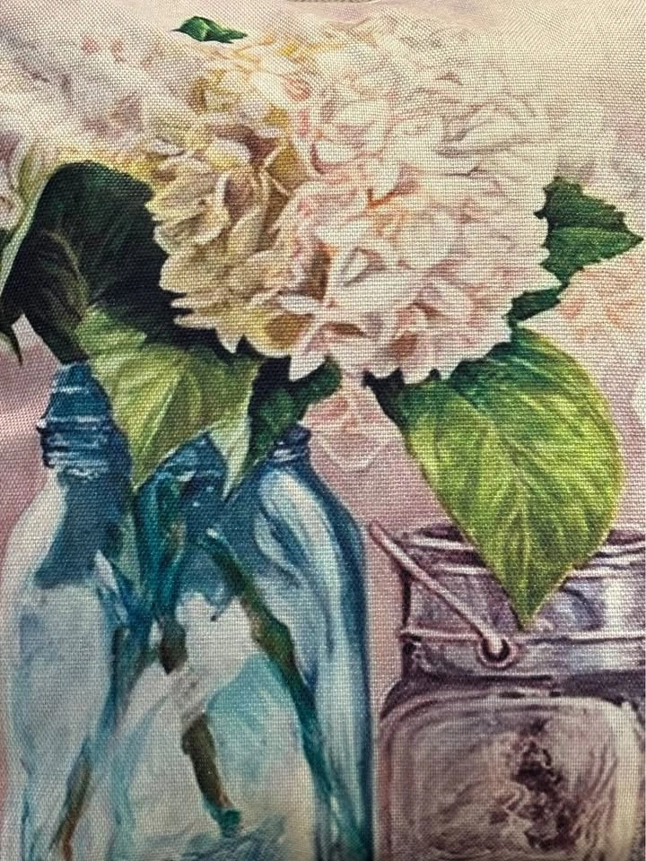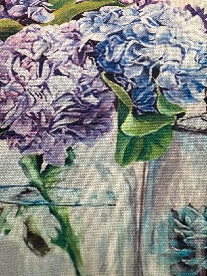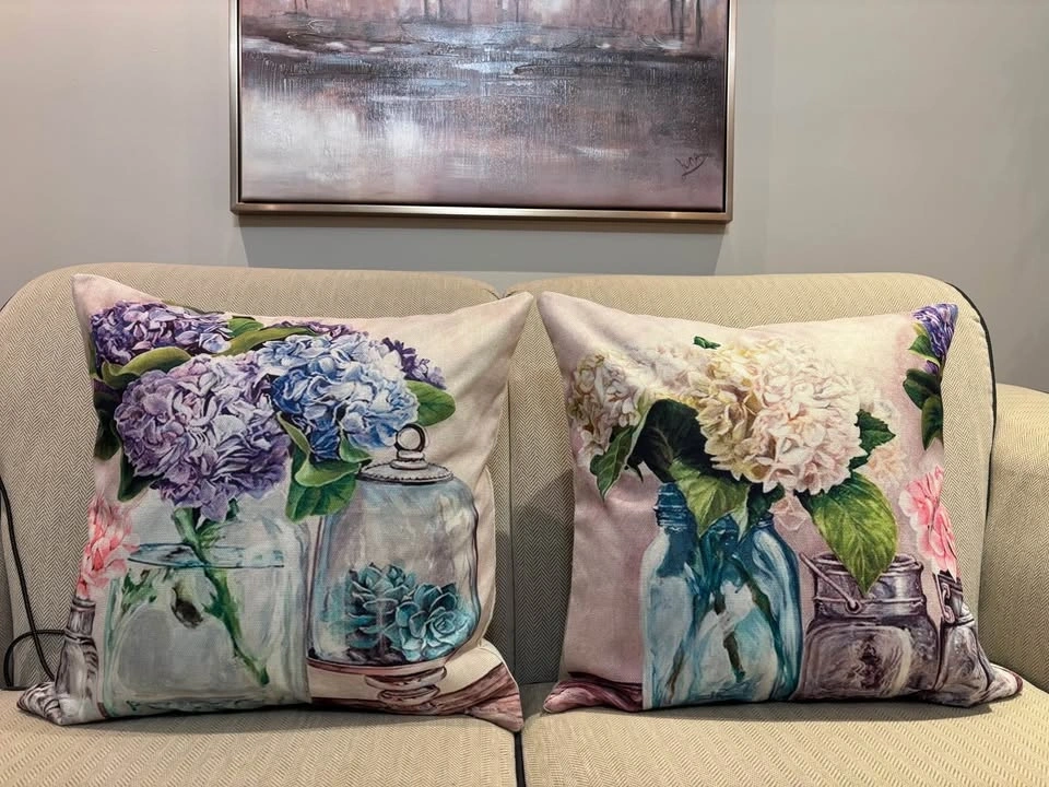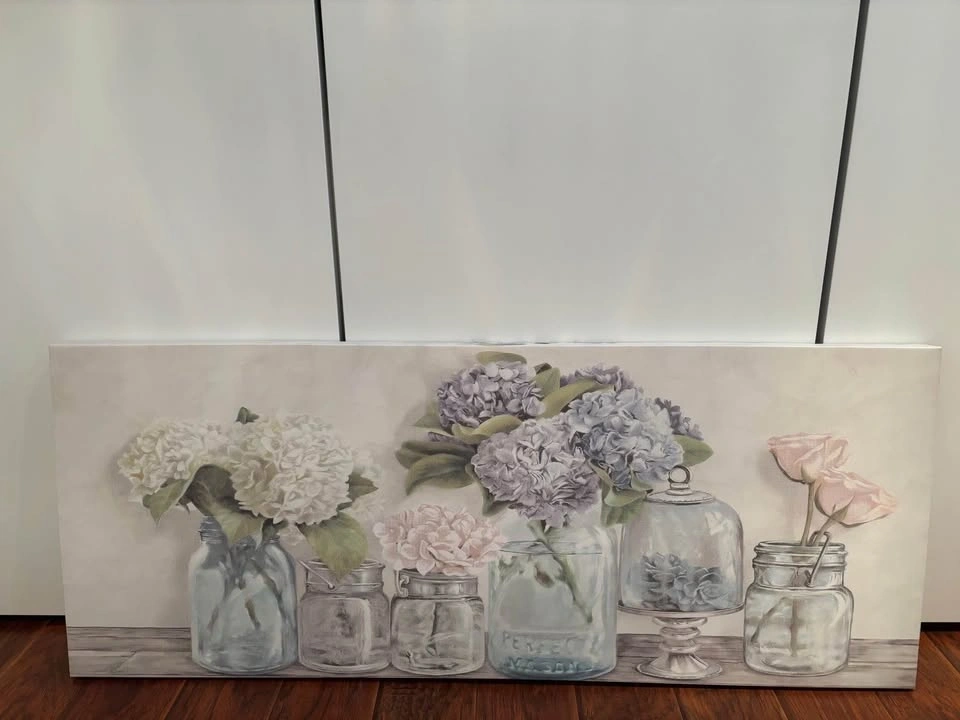 Very lovely wide soft and colourful peonies in glass vases and jars canvas art. 55" wide x 23" high. Well made and strong. Includes 2 matching 20” cushion covers - $15 (inserts not included). From a smoke and pet free home. Pick up in Keswick.