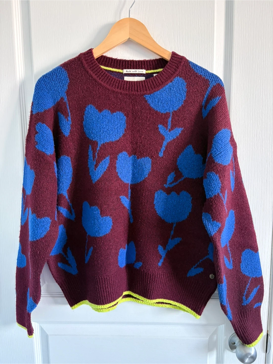 Cozy crewneck sweater featuring a maroon base with a bold blue floral pattern. It has ribbed cuffs and hem with a neon yellow accent trim. This sweater adds a fun pop of colour to any outfit!