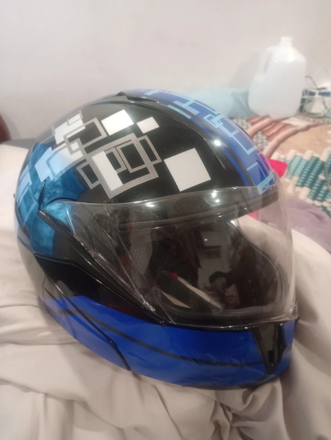 Blue Motorcycle Helmet with Graphic Design