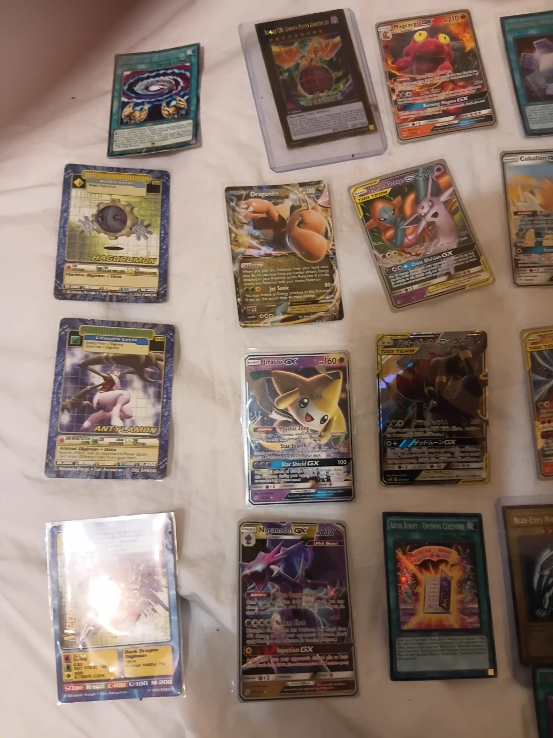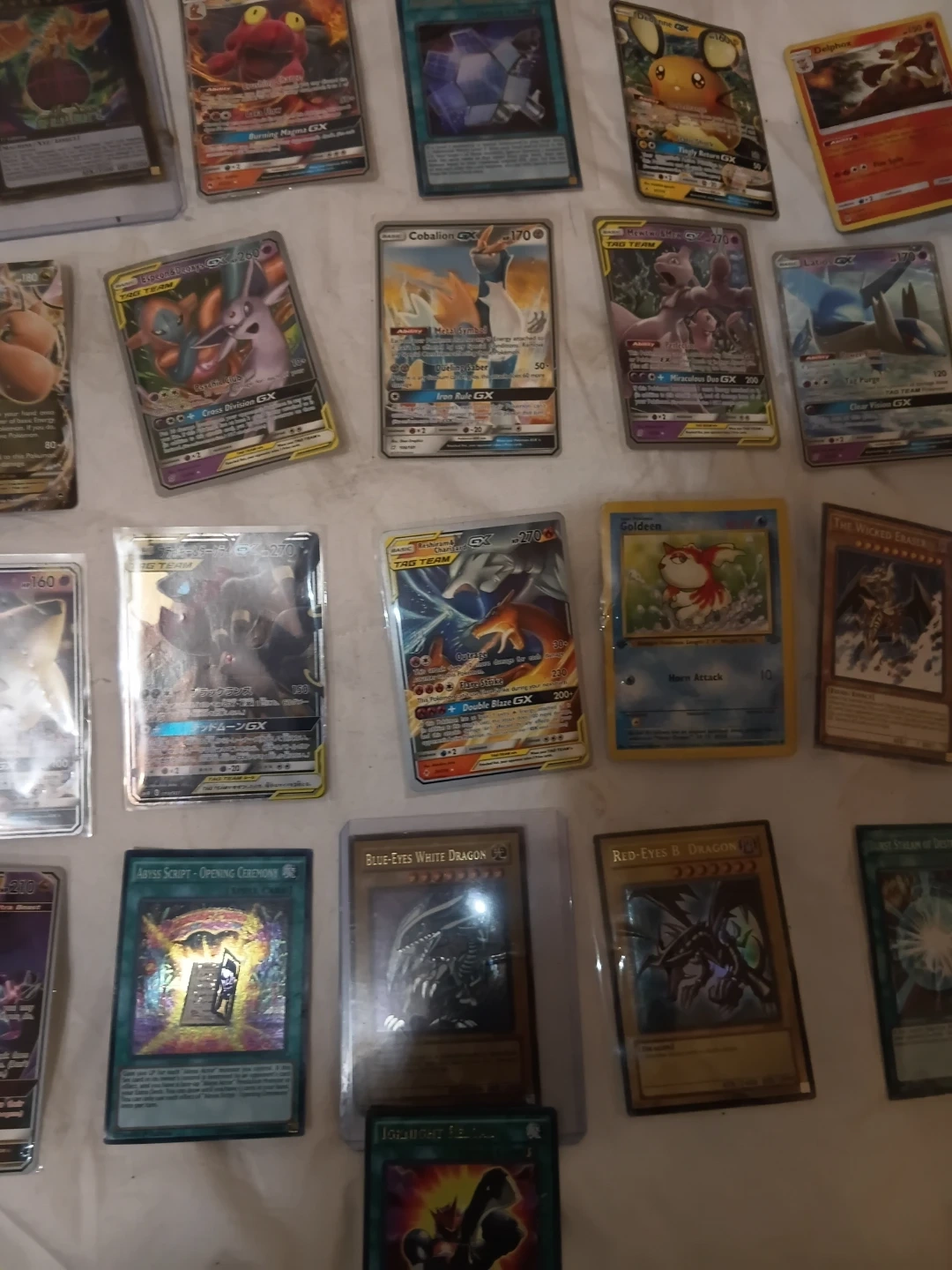 Collection of various Pokemon and Yu-Gi-Oh! trading cards, including several GX and EX versions. Cards feature distinct artwork and stats for gameplay or collecting. Great for fans and collectors of all ages!