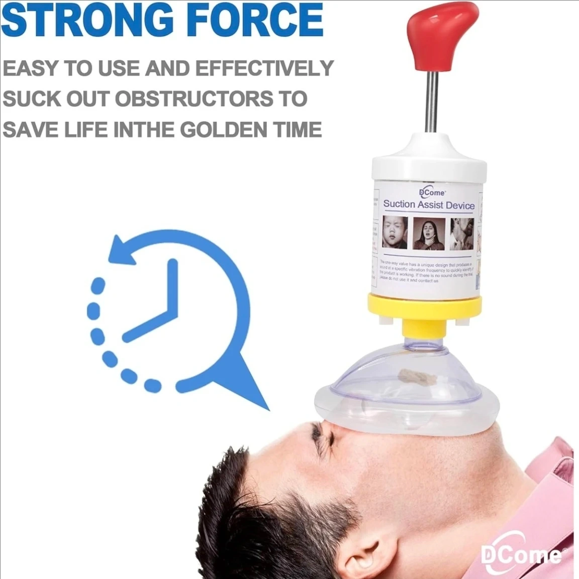 This is a D-Come Suction Assist Device for airway clearance. It's designed for easy use and to effectively suck out obstructions. It comes with an adult mask and an infant mask.