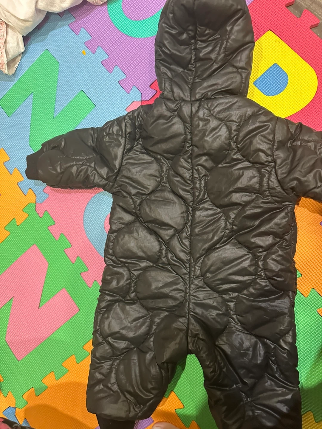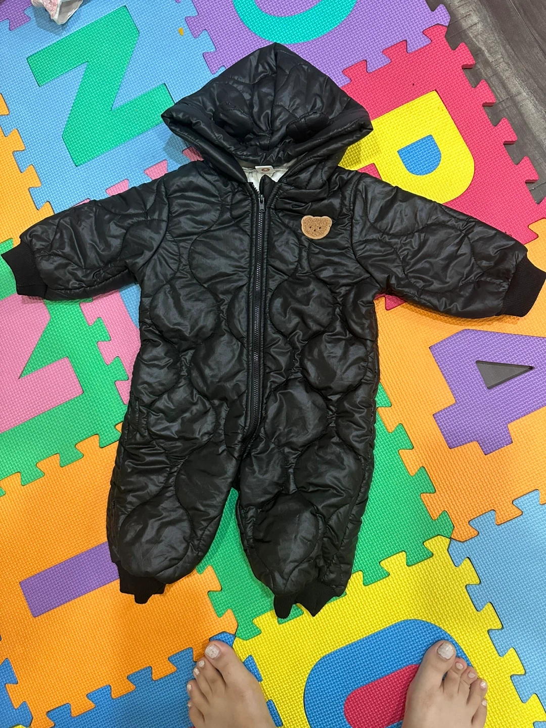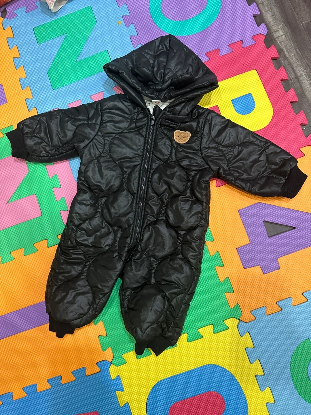 Warm black puffer snowsuit with a quilted heart pattern. It has a full zipper front and a cozy fleece-lined hood. Features a cute teddy bear patch on the chest.
