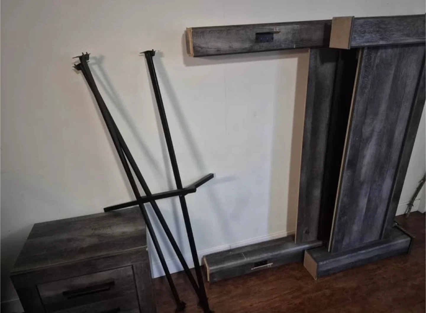 This rustic grey wood bed frame and surround is a great addition to any living space. It features a weathered wood finish that adds character and charm. Includes black metal legs for support. It's ready to bring warmth and style to your home!
