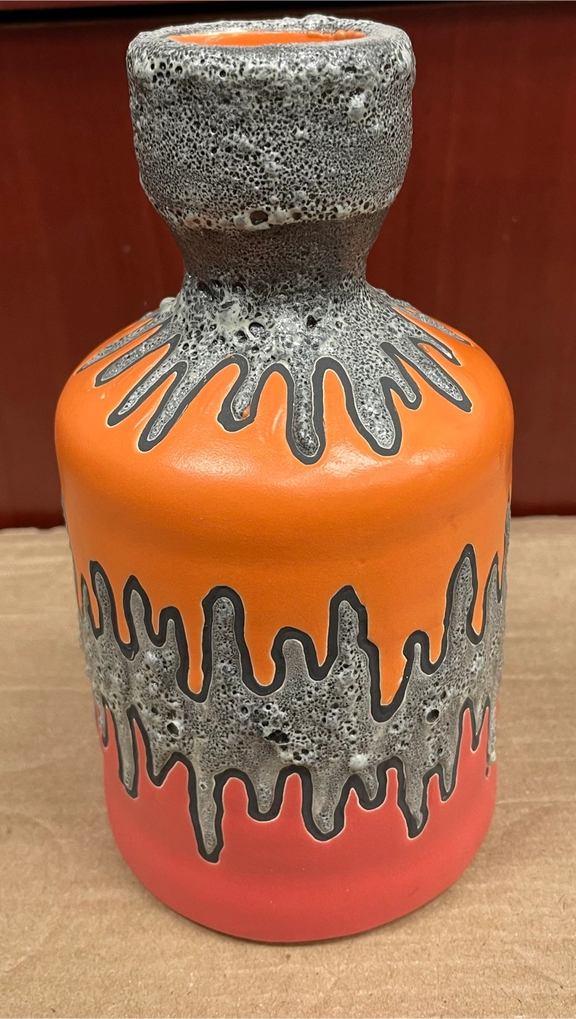 Retro ceramic vase with an orange, grey, and red lava glaze design. It's a striking decorative piece. Unique textured finish.