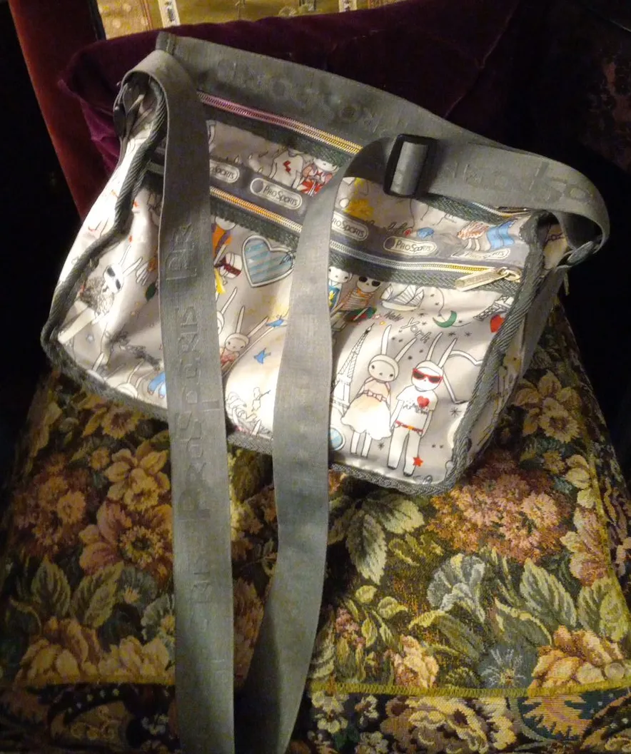 This is a multi pocketed PROSPORT, lightweight carry all crossbody bag. It has love bunnies traveling the globe holding hands and loving every minute of it. The zippered compartments are beautifully colourful and slide easily as does the wide adjustable shoulder strap. The London, Paris, New York, Hong Kong motifs are splashed along side the traveling couple. There is a zipper around the circumfrance to enlargen the bag when shopping. PS. The inside is oh so pretty too!♡