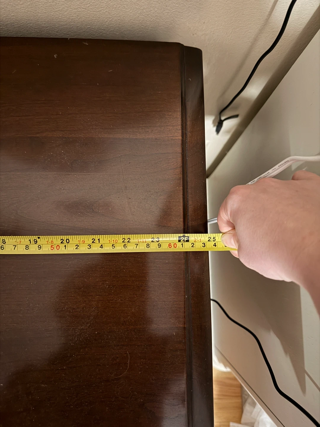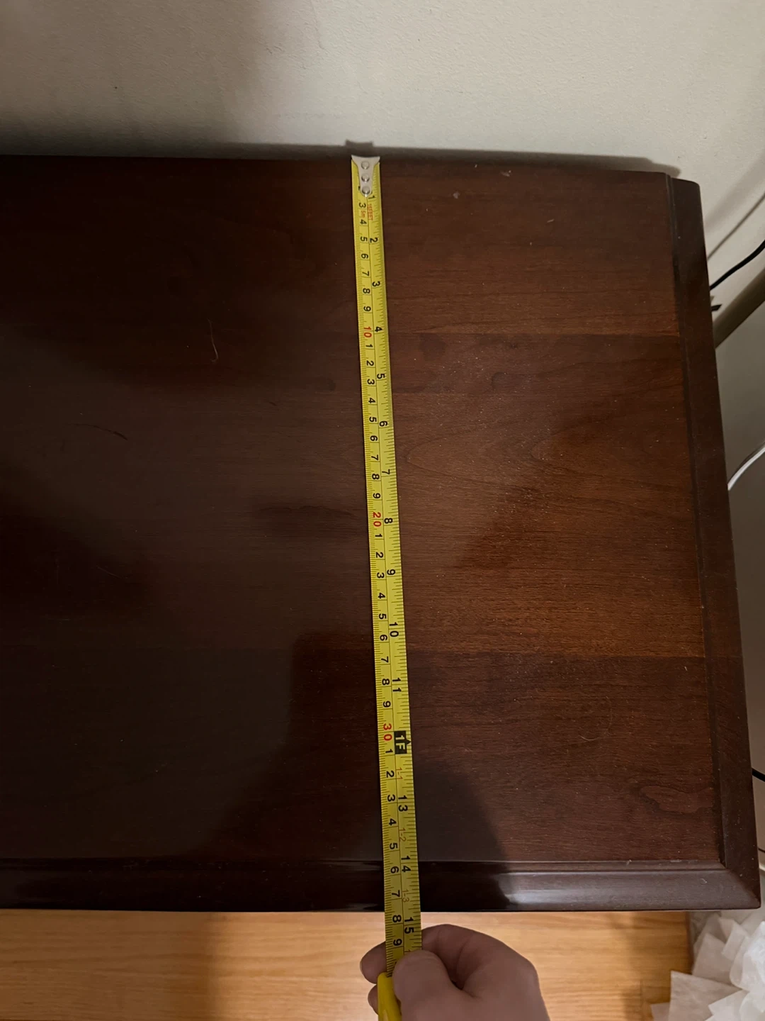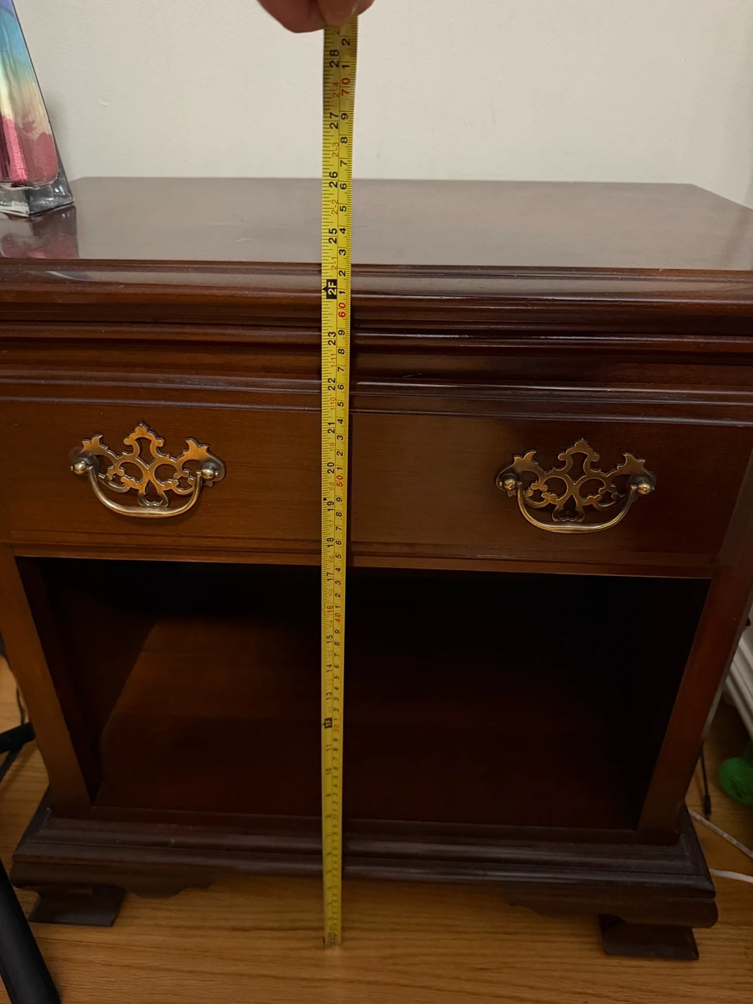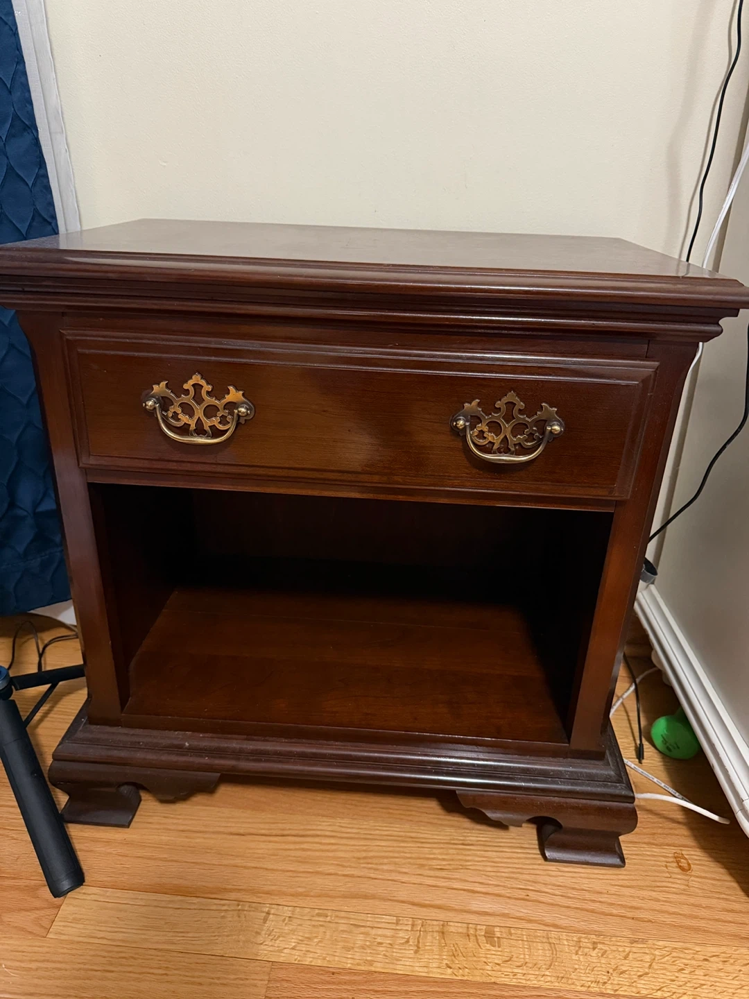 This is a classic dark brown wooden nightstand. It features one drawer with ornate brass hardware and an open shelf below. Height is approximately 27 inches, width is 24 inches, and depth is 17 inches. It's a solid piece of furniture that'll fit well in any bedroom.