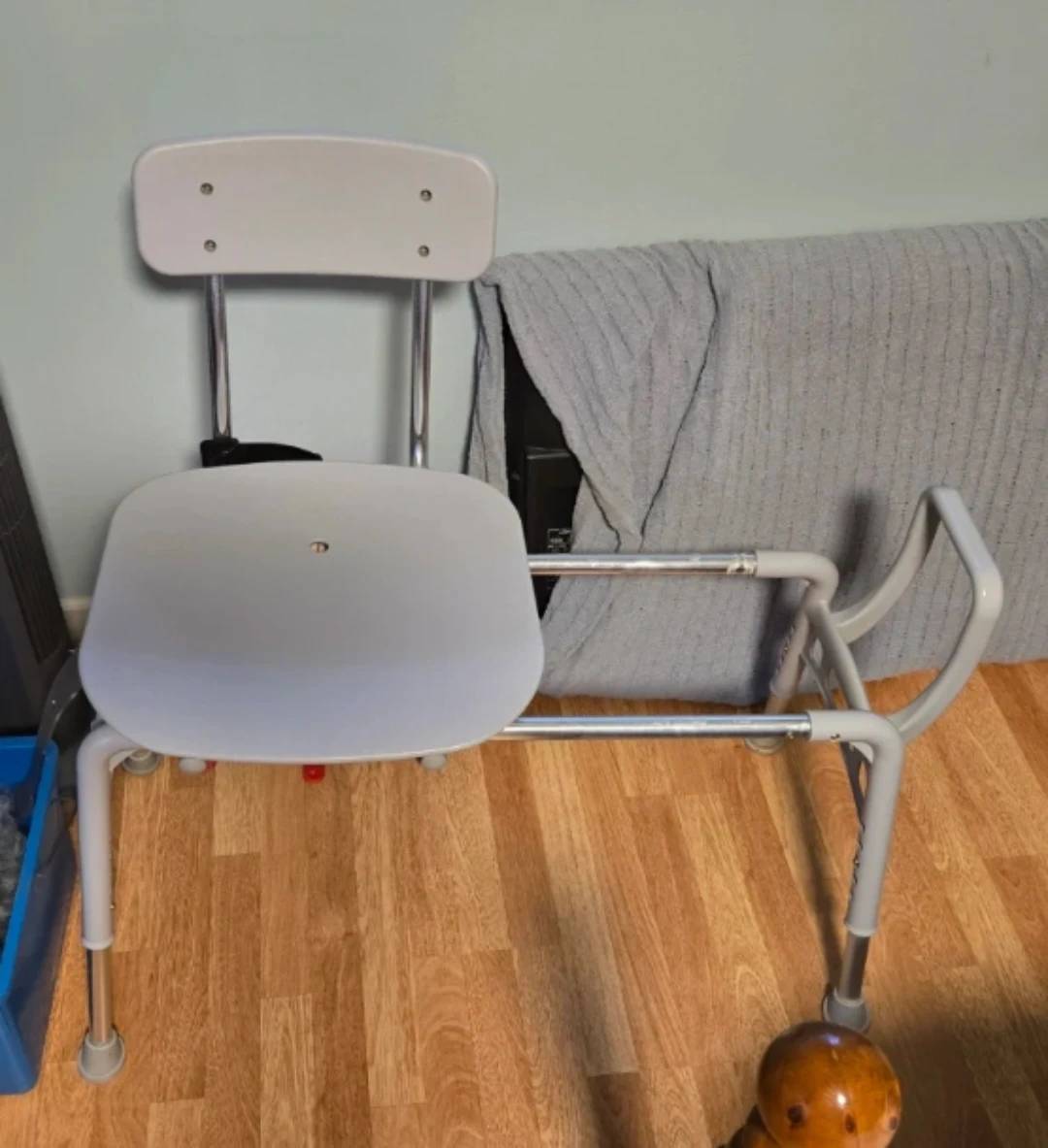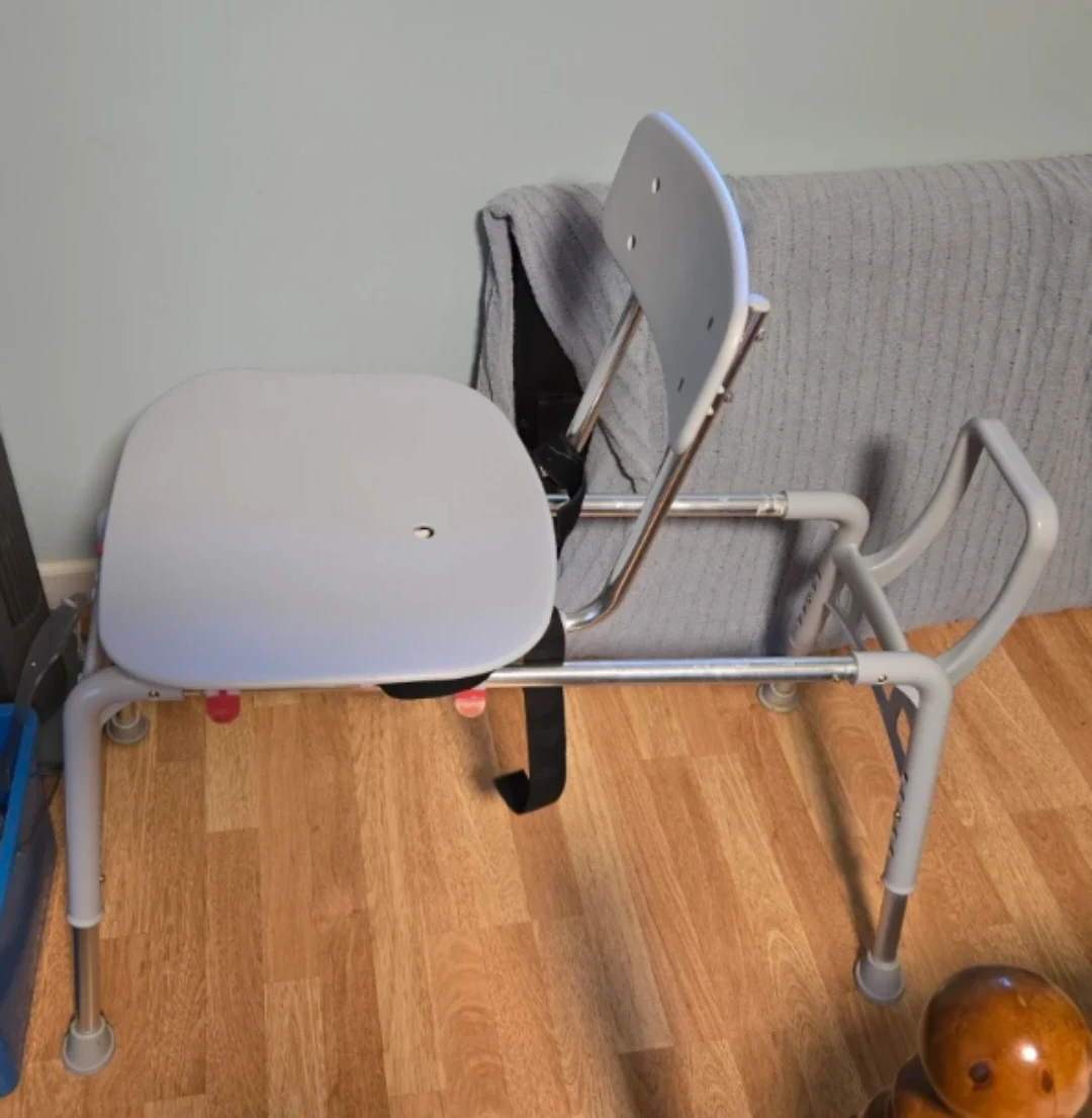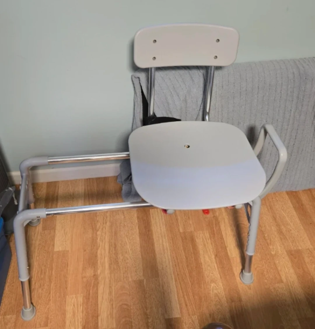 This shower chair provides a sturdy seating option for the bath or shower. It's made of durable plastic and metal. The adjustable legs ensure it fits different tub heights. Provides added stability and safety for users. The Chair slides and rotates that makes it easy to get in and out of the tub.